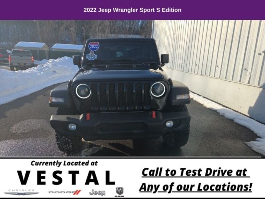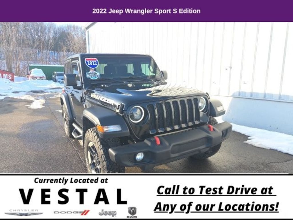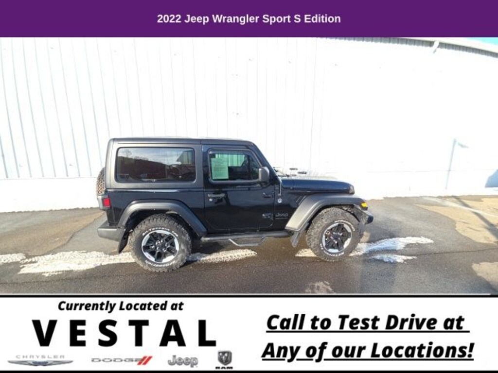 3.45 Overall Top Gear Ratio, 4-Wheel Disc Brakes, 7.0" Touchscreen Display, 8 Speakers, ABS brakes, Air Conditioning, Air Conditioning w/Auto Temperature Control, Air Filtering, AM/FM radio, Apple CarPlay, Automatic Headlamps, Auxiliary Battery, Black 3-Piece Hard Top, Brake assist, Cloth Low-Back Bucket Seats, Cluster 7.0" TFT Color Display, Compass, Corning Gorilla Glass, Deep Tint Sunscreen Windows, Delay-off headlights, Driver door bin, Driver vanity mirror, Dual front impact airbags, Dual front side impact airbags, Electronic Stability Control, Emergency communication system: SiriusXM Guardian, Engine Oil Cooler, For More Info, Call 800-643-2112, Freedom Panel Storage Bag, Front 1-Touch Down Power Windows, Front anti-roll bar, Front Bucket Seats, Front Center Armrest w/Storage, Front Door Locks 2-Door Passive Entry, Front fog lights, Front reading lights, Global Telematics Box Module (TBM), Google Android Auto, GPS Antenna Input, Integrated Center Stack Radio, Integrated roll-over protection, Integrated Voice Command w/Bluetooth, Leather Wrapped Steering Wheel, Low tire pressure warning, MOPAR All-Weather Floor Mats, No Soft Top, Non-Locking Fuel Cap w/o Discriminator, Normal Duty Suspension, Occupant sensing airbag, Outside temperature display, ParkView Rear Back-Up Camera, Passenger door bin, Passenger vanity mirror, Power Heated Mirrors, Power steering, Quick Order Package 24S Sport S (DISC), R1234YF A/C Refrigerant, Radio data system, Radio: Uconnect 3 w/5" Display, Radio: Uconnect 4 w/7" Display, Rear anti-roll bar, Rear reading lights, Rear Window Defroster, Rear Window Wiper/Washer, Remote Keyless Entry, Security Alarm, SiriusXM Guardian-Included Trial (B), SiriusXM Radio Service, SiriusXM Satellite Radio, Speed control, Speed Sensitive Power Locks, Sport S, Start-Stop Dual Battery System, Steering wheel mounted audio controls, Sun Visors w/Illuminated Vanity Mirrors, Tachometer, Technology Group, Telescoping steering wheel, Tilt steering wheel, Traction control, Trip computer, USB Host Flip, Variably intermittent wipers, Wheels: 17" x 7.5" Black Steel Styled, Wheels: 17" x 7.5" Machined Granite Crystal, Wheels: 17" x 7.5" Tech Silver Aluminum. 2022 Jeep Wrangler 2D Sport Utility Sport S Black Clearcoat TECH GROUP HARD TOP 4WD 8-Speed Automatic 3.6L V6 24V VVT
