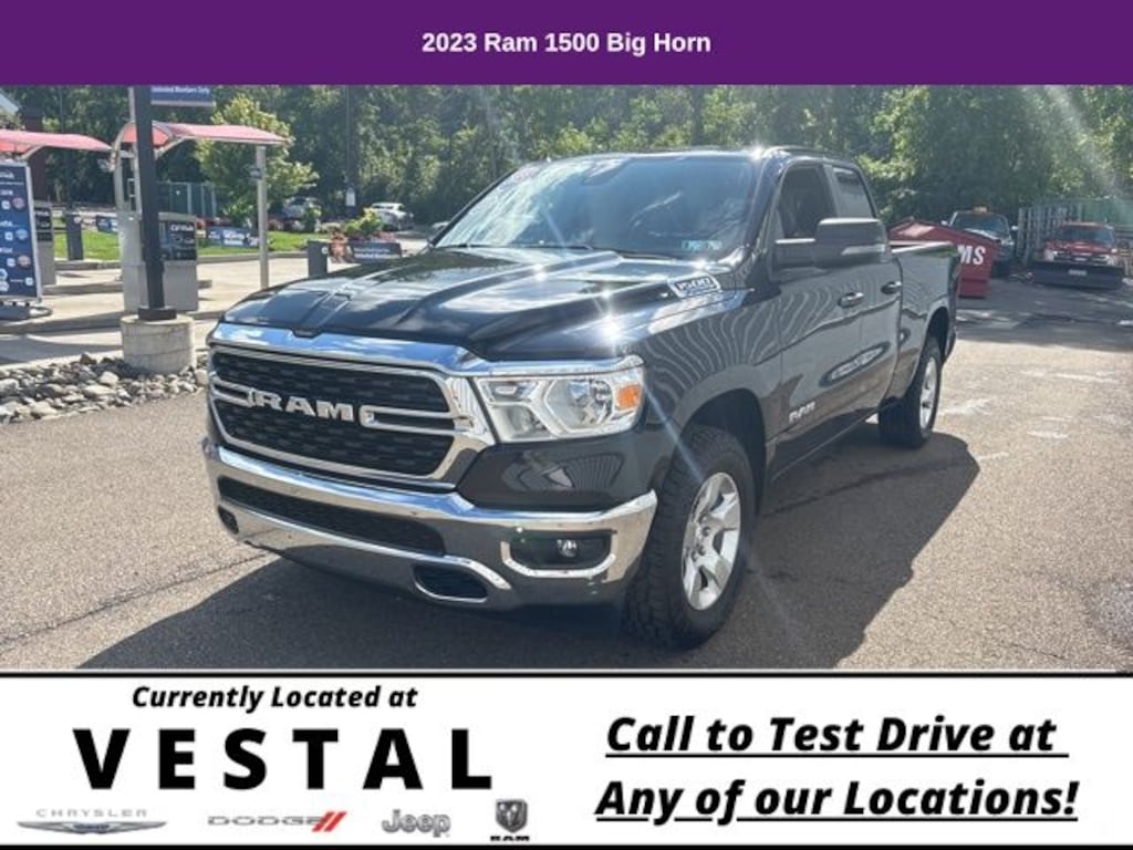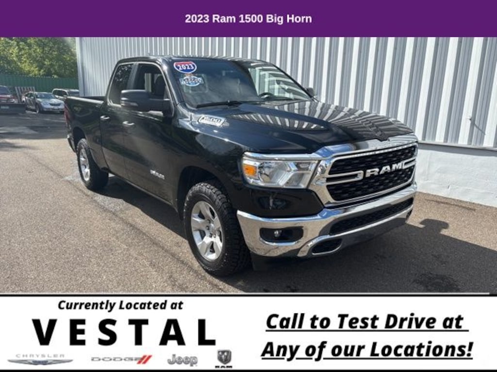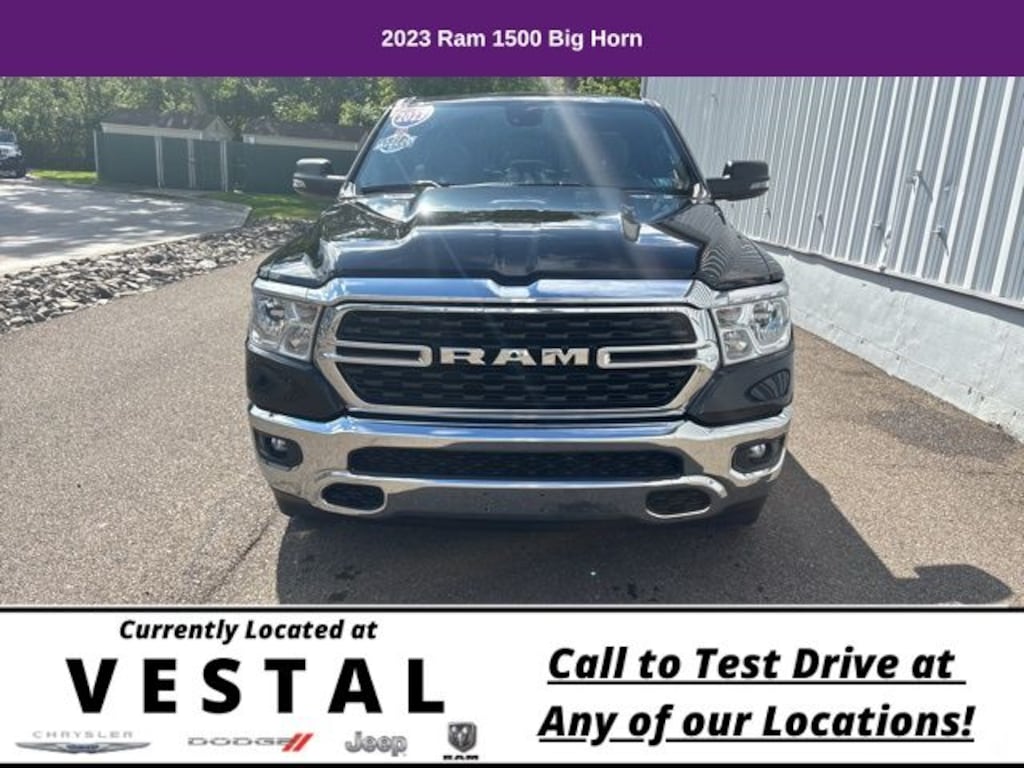 Save Time at the Dealership by Customizing your Deal Online!, Accident Free History, Super Low Miles, 4G LTE Wi-Fi Hot Spot, 8.4" Touchscreen Display, Apple CarPlay, Auto-Dimming Exterior Driver Mirror, Auto-Dimming Rear-View Mirror, Big Horn Badge, Big Horn Level 1 Equipment Group, Black Exterior Mirrors, Black Premium Power Mirrors, Bluetooth Handsfree Phone & Audio, Class IV Receiver Hitch, Connectivity - US/Canada, Electric Shift-On-Demand Transfer Case, Exterior Mirrors Courtesy Lamps, Exterior Mirrors w/Heating Element, Exterior Mirrors w/Supplemental Signals, For Details, Visit DriveUconnect.com, For More Info, Call 800-643-2112, Front Fog Lamps, Glove Box Lamp, Google Android Auto, GPS Antenna Input, Heated Front Seats, Heated Steering Wheel, Integrated Center Stack Radio, Passenger Sun Visor w/Illuminated Mirror, Power-Folding Mirrors, Quick Order Package 23Z Big Horn, Radio: Uconnect 5 W w/8.4" Display, Rear Dome w/On/Off Switch Lamp, Rear Power Sliding Window, Rear Window Defroster, SiriusXM Satellite Radio, USB Host Flip, 3 Rear Seat Head Restraints, 3.21 Rear Axle Ratio, 4 Way Front Headrests, 4-Wheel Disc Brakes, 48V Belt Starter Generator, 6 Speakers, ABS brakes, Air Conditioning, Alloy wheels, AM/FM radio, Anti-Spin Differential Rear Axle, Bluetooth, Brake assist, Bumpers: chrome, Cloth Bench Seat, Compass, Convex Wide-Angle Mirror Insert, Delay-off headlights, Driver door bin, Dual front impact airbags, Dual front side impact airbags, Electronic Stability Control, Emergency communication system: SiriusXM Guardian, Front anti-roll bar, Front Center Armrest w/Storage, Front reading lights, Front Seat Back Map Pockets, Front wheel independent suspension, Fully automatic headlights, Heated door mirrors, Illuminated entry, Integrated Voice Command w/Bluetooth, Leather steering wheel, Low tire pressure warning, Manual Adjust 4-Way Front Passenger Seat, Manufacturer's Statement of Origin, Occupant sensing airbag, Outside temperature display, Overhead airbag, Overhead console, Panic alarm, ParkView Rear Back-Up Camera, Passenger door bin, Passenger vanity mirror, Power door mirrors, Power steering, Power windows, Radio data system, Radio: Uconnect 3 w/5" Display, Rear 60/40 Folding Seat, Rear anti-roll bar, Rear seat center armrest, Rear step bumper, Remote keyless entry, Speed control, Split folding rear seat, Steering wheel mounted audio controls, Tachometer, Telescoping steering wheel, Tilt steering wheel, Traction control, Trailer Brake Control, Trip computer, Variably intermittent wipers, Wheels: 18" x 8" Cast-Aluminum Painted, 1 Owner, 4G LTE Wi-Fi Hot Spot, 8.4" Touchscreen Display, Apple CarPlay, Auto-Dimming Exterior Driver Mirror, Auto-Dimming Rear-View Mirror, Big Horn Badge, Big Horn Level 1 Equipment Group, Black Exterior Mirrors, Black Premium Power Mirrors, Bluetooth Handsfree Phone & Audio, Class IV Receiver Hitch, Connectivity - US/Canada, Electric Shift-On-Demand Transfer Case, Exterior Mirrors Courtesy Lamps, Exterior Mirrors w/Heating Element, Exterior Mirrors w/Supplemental Signals, For Details, Visit DriveUconnect.com, For More Info, Call 800-643-2112, Front Fog Lamps, Glove Box Lamp, Google Android Auto, GPS Antenna Input, Heated Front Seats, Heated Steering Wheel, Integrated Center Stack Radio, Passenger Sun Visor w/Illuminated Mirror, Power-Folding Mirrors, Quick Order Package 23Z Big Horn, Radio: Uconnect 5 W w/8.4" Display, Rear Dome w/On/Off Switch Lamp, Rear Power Sliding Window, Rear Window Defroster, SiriusXM Satellite Radio, USB Host Flip. 2023 Ram 1500 4D Quad Cab Big Horn/Lone Star Diamond Black Crystal Pearlcoat 4x4 4WD 8-Speed Automatic 3.6L V6 24V VVT