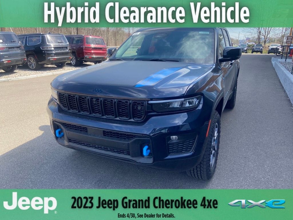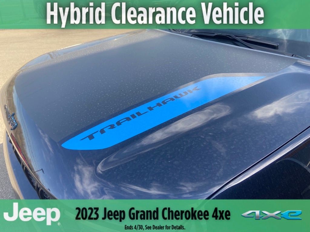 Midnight Sky 2023 Jeep Grand Cherokee Trailhawk 4xe 4WD 8-Speed Automatic 2.0L I4 DOHC 2.0L I4 DOHC, 4WD, 10 Speakers, 2nd-Row Manual Window Shades, 3.70 Rear Axle Ratio, 4-Wheel Disc Brakes, ABS brakes, Adaptive suspension, Advanced Protech Group II, Air Conditioning, Alloy wheels, AM/FM radio: SiriusXM with 360L, Anti-whiplash front head restraints, Audio memory, Auto High-beam Headlights, Auto-dimming door mirrors, Auto-dimming Rear-View mirror, Auto-leveling suspension, Automatic temperature control, Bluetooth, Brake assist, Bumpers: body-color, Capri Leather/Suede Seats, Compass, Delay-off headlights, Driver door bin, Driver vanity mirror, Dual front impact airbags, Dual front side impact airbags, Electronic Stability Control, Four wheel independent suspension, Front anti-roll bar, Front Bucket Seats, Front Center Armrest w/Storage, Front dual zone A/C, Front fog lights, Front License Plate Bracket, Front reading lights, Fully automatic headlights, Garage door transmitter, Hands-Free Power Liftgate, Heated door mirrors, Heated front seats, Heated rear seats, Heated steering wheel, Heavy Duty Suspension, Illuminated entry, Intersection Collision Assist System, Knee airbag, Leather Shift Knob, Low tire pressure warning, Luxury Tech Group III, Manufacturer's Statement of Origin (DISC), Memory seat, Memory Steering Column, Navigation System, Night Vision/Pedestrian-Animal Detection, Occupant sensing airbag, Outside temperature display, Overhead airbag, Overhead console, Panic alarm, ParkSense Front/Rear Park Assist w/Stop, Passenger door bin, Passenger vanity mirror, Passive Entry - Front/Rear Doors, Liftgate, Power door mirrors, Power driver seat, Power Liftgate, Power passenger seat, Power steering, Power Tilt/Telescope Steering Column, Power windows, Quick Order Package 27K, Radio data system, Radio: Uconnect 5 Nav w/10.1" Display, Rain Sensitive Windshield Wipers, Rear anti-roll bar, Rear reading lights, Rear seat center armrest, Rear window defroster, Rear window wiper, Rearview Autodim Digital Display Mirror, Remote keyless entry, Security system, Speed control, Speed-Sensitive Wipers, Split folding rear seat, Spoiler, Steering wheel mounted audio controls, Surround View Camera System, Tachometer, Telescoping steering wheel, Tilt steering wheel, Traction control, Trip computer, Turn signal indicator mirrors, Two Tone Paint Group, Variably intermittent wipers, Ventilated front seats, Wheels: 18" x 8" Machined Face/Painted Aluminum, Wireless Charging Pad, 2.0L I4 DOHC, 4WD.