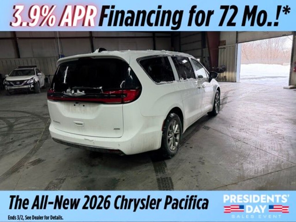 Bright White Clearcoat 2026 Chrysler Pacifica Select AWD 9-Speed 948TE Automatic 3.6L V6 24V VVT Save Time at the Dealership by Customizing your Deal Online!, 10.1" Touchscreen Display, 18" x 7.5" Painted Aluminum Wheels, 3.73 Axle Ratio, 3rd row seats: split-bench, 4-Wheel Disc Brakes, 4G LTE Wi-Fi Hot Spot, 6 Speakers, ABS brakes, Air Conditioning, Alloy wheels, AM/FM radio: SiriusXM, Apple CarPlay, Apple CarPlay/Android Auto, Auto-dimming Rear-View mirror, Automatic temperature control, AWD Suspension, Black Seats, Brake assist, Bumpers: body-color, Caprice Leatherette Bucket Seats, Compass, Connectivity - US/Canada, Delay-off headlights, Disassociated Touchscreen Display, Driver door bin, Driver vanity mirror, Driver's Seat Mounted Armrest, Dual front impact airbags, Dual front side impact airbags, Electronic Stability Control, Emergency communication system: Chrysler Connect, For Details, Visit DriveUconnect.com, Four wheel independent suspension, Front anti-roll bar, Front Bucket Seats, Front dual zone A/C, Front fog lights, Front reading lights, Fully automatic headlights, Garage door transmitter, Google Android Auto, GPS Antenna Input, Heated door mirrors, Heated front seats, Heated steering wheel, Illuminated entry, Integrated Active Noise Cancellation, Integrated Center Stack Radio, Knee airbag, Low tire pressure warning, Memory seat, MyFlexCare Service Plan, Occupant sensing airbag, Outside temperature display, Overhead airbag, Overhead console, Panic alarm, ParkView Rear Back-Up Camera, Passenger door bin, Passenger seat mounted armrest, Passenger vanity mirror, Power door mirrors, Power driver seat, Power Liftgate, Power steering, Power windows, Quick Order Package 27L, Radio data system, Radio: Uconnect 5 with 10.1" Display, Rain sensing wipers, Rear air conditioning, Rear reading lights, Rear window defroster, Rear window wiper, Reclining 3rd row seat, Remote keyless entry, Security system, Speed control, Split folding rear seat, Spoiler, Steering wheel mounted audio controls, Tachometer, Telescoping steering wheel, Tilt steering wheel, Traction control, Trip computer, Turn signal indicator mirrors, USB Host Flip, Variably intermittent wipers, Voltmeter.
