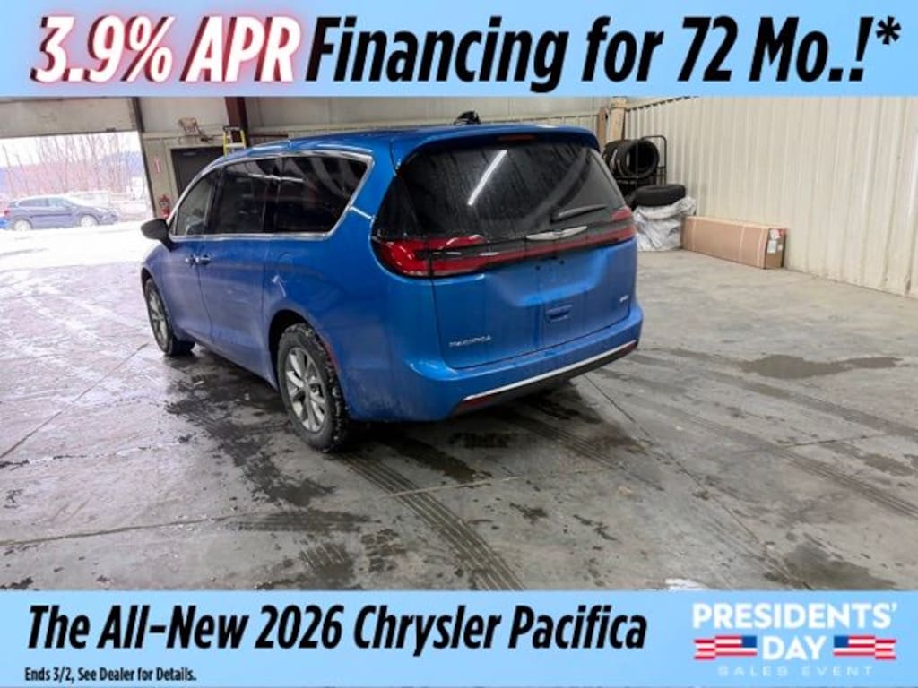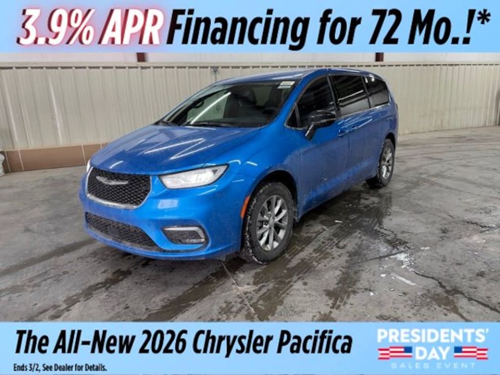 Hydro Blue Pearlcoat 2026 Chrysler Pacifica Select AWD 9-Speed 948TE Automatic 3.6L V6 24V VVT Save Time at the Dealership by Customizing your Deal Online!, 10.1" Touchscreen Display, 18" x 7.5" Painted Aluminum Wheels, 3.73 Axle Ratio, 3rd row seats: split-bench, 4-Wheel Disc Brakes, 4G LTE Wi-Fi Hot Spot, 6 Speakers, ABS brakes, Air Conditioning, Alloy wheels, AM/FM radio: SiriusXM, Apple CarPlay, Apple CarPlay/Android Auto, Auto-dimming Rear-View mirror, Automatic temperature control, AWD Suspension, Black Seats, Brake assist, Bumpers: body-color, Caprice Leatherette Bucket Seats, Compass, Connectivity - US/Canada, Delay-off headlights, Disassociated Touchscreen Display, Driver door bin, Driver vanity mirror, Driver's Seat Mounted Armrest, Dual front impact airbags, Dual front side impact airbags, Electronic Stability Control, Emergency communication system: Chrysler Connect, For Details, Visit DriveUconnect.com, Four wheel independent suspension, Front anti-roll bar, Front Bucket Seats, Front dual zone A/C, Front fog lights, Front reading lights, Fully automatic headlights, Garage door transmitter, Google Android Auto, GPS Antenna Input, Heated door mirrors, Heated front seats, Heated steering wheel, Illuminated entry, Integrated Active Noise Cancellation, Integrated Center Stack Radio, Knee airbag, Low tire pressure warning, Memory seat, MyFlexCare Service Plan, Occupant sensing airbag, Outside temperature display, Overhead airbag, Overhead console, Panic alarm, ParkView Rear Back-Up Camera, Passenger door bin, Passenger seat mounted armrest, Passenger vanity mirror, Power door mirrors, Power driver seat, Power Liftgate, Power steering, Power windows, Quick Order Package 27L, Radio data system, Radio: Uconnect 5 with 10.1" Display, Rain sensing wipers, Rear air conditioning, Rear reading lights, Rear window defroster, Rear window wiper, Reclining 3rd row seat, Remote keyless entry, Security system, Speed control, Split folding rear seat, Spoiler, Steering wheel mounted audio controls, Tachometer, Telescoping steering wheel, Tilt steering wheel, Traction control, Trip computer, Turn signal indicator mirrors, USB Host Flip, Variably intermittent wipers, Voltmeter.