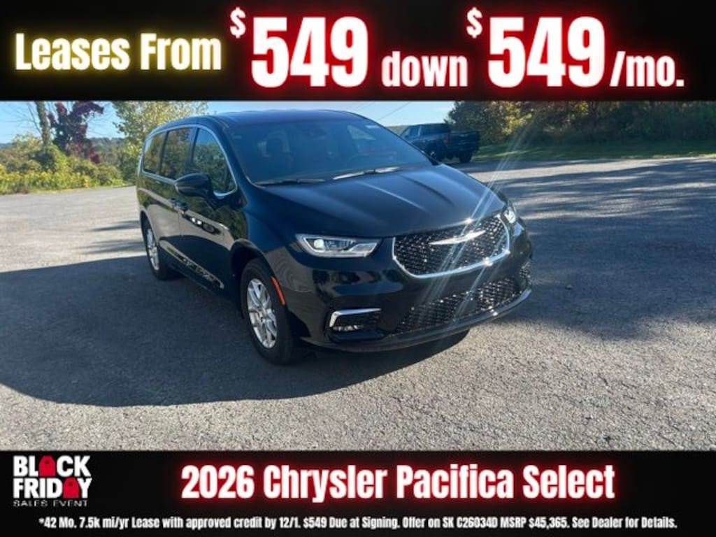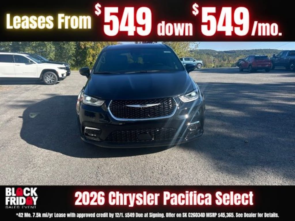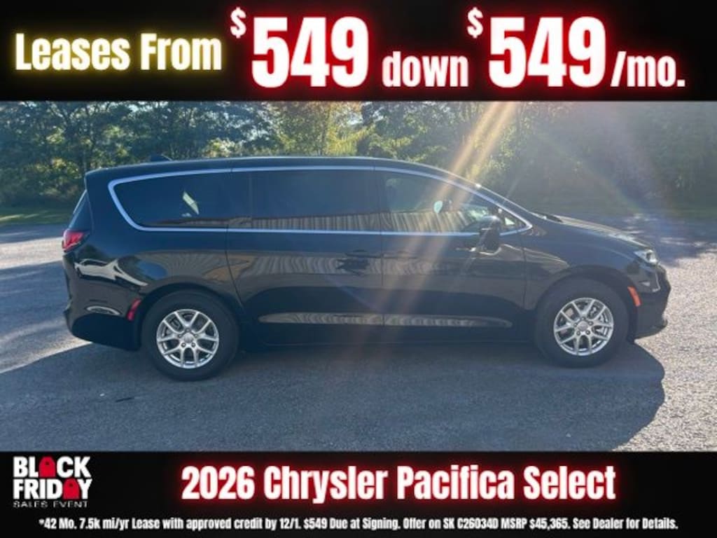 Diamond Black Crystal Pearlcoat 2026 Chrysler Pacifica Select FWD 9-Speed Automatic 3.6L V6 Save Time at the Dealership by Customizing your Deal Online!, 10.1" Touchscreen Display, 17" x 7.0" Aluminum Wheels, 3.25 Axle Ratio, 3rd row seats: split-bench, 4-Wheel Disc Brakes, 4G LTE Wi-Fi Hot Spot, 6 Speakers, 8-Passenger Seating, ABS brakes, Air Conditioning, Alloy wheels, AM/FM radio: SiriusXM, Apple CarPlay, Apple CarPlay/Android Auto, Auto-dimming Rear-View mirror, Automatic temperature control, Black Seats, Brake assist, Bumpers: body-color, Caprice Leatherette Bucket Seats, Compass, Connectivity - US/Canada, Delay-off headlights, Disassociated Touchscreen Display, Driver door bin, Driver vanity mirror, Driver's Seat Mounted Armrest, Dual front impact airbags, Dual front side impact airbags, Electronic Stability Control, Emergency communication system: Chrysler Connect, For Details, Visit DriveUconnect.com, Four wheel independent suspension, Front anti-roll bar, Front Bucket Seats, Front dual zone A/C, Front fog lights, Front reading lights, Fully automatic headlights, Garage door transmitter, Google Android Auto, GPS Antenna Input, Heated door mirrors, Heated front seats, Heated steering wheel, Illuminated entry, Integrated Active Noise Cancellation, Integrated Center Stack Radio, Knee airbag, Low tire pressure warning, Memory seat, Occupant sensing airbag, Outside temperature display, Overhead airbag, Overhead console, Panic alarm, ParkView Rear Back-Up Camera, Passenger door bin, Passenger seat mounted armrest, Passenger vanity mirror, Power door mirrors, Power driver seat, Power Liftgate, Power steering, Power windows, Quick Order Package 27L, Radio data system, Radio: Uconnect 5 w/10.1" Display, Rain sensing wipers, Rear air conditioning, Rear reading lights, Rear window defroster, Rear window wiper, Reclining 3rd row seat, Remote keyless entry, Security system, Speed control, Split folding rear seat, Spoiler, Steering wheel mounted audio controls, Tachometer, Telescoping steering wheel, Tilt steering wheel, Touring Suspension, Traction control, Trip computer, Turn signal indicator mirrors, USB Host Flip, Variably intermittent wipers, Voltmeter.