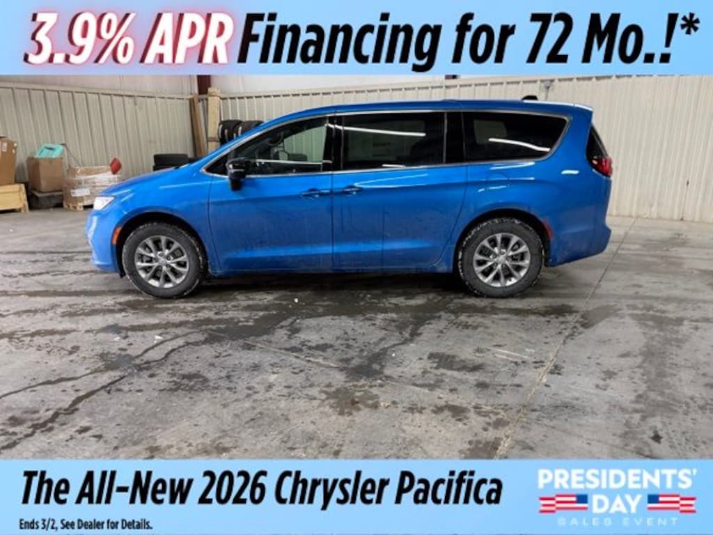 Hydro Blue Pearlcoat 2026 Chrysler Pacifica Select AWD 9-Speed 948TE Automatic 3.6L V6 24V VVT 10.1" Touchscreen Display, 18" x 7.5" Painted Aluminum Wheels, 3.73 Axle Ratio, 3rd row seats: split-bench, 4-Wheel Disc Brakes, 4G LTE Wi-Fi Hot Spot, 6 Speakers, ABS brakes, Air Conditioning, Alloy wheels, AM/FM radio: SiriusXM, Apple CarPlay, Apple CarPlay/Android Auto, Auto-dimming Rear-View mirror, Automatic temperature control, AWD Suspension, Black Seats, Bluetooth, Brake assist, Bumpers: body-color, Caprice Leatherette Bucket Seats, Compass, Connectivity - US/Canada, Delay-off headlights, Disassociated Touchscreen Display, Driver door bin, Driver vanity mirror, Driver's Seat Mounted Armrest, Dual front impact airbags, Dual front side impact airbags, Electronic Stability Control, Emergency communication system: Chrysler Connect, For Details, Visit DriveUconnect.com, Four wheel independent suspension, Front anti-roll bar, Front Bucket Seats, Front dual zone A/C, Front fog lights, Front reading lights, Fully automatic headlights, Garage door transmitter, Google Android Auto, GPS Antenna Input, Heated door mirrors, Heated front seats, Heated steering wheel, Illuminated entry, Integrated Active Noise Cancellation, Integrated Center Stack Radio, Knee airbag, Low tire pressure warning, Memory seat, MyFlexCare Service Plan, Occupant sensing airbag, Outside temperature display, Overhead airbag, Overhead console, Panic alarm, ParkView Rear Back-Up Camera, Passenger door bin, Passenger seat mounted armrest, Passenger vanity mirror, Power door mirrors, Power driver seat, Power Liftgate, Power steering, Power windows, Quick Order Package 27L, Radio data system, Radio: Uconnect 5 with 10.1" Display, Rain sensing wipers, Rear air conditioning, Rear reading lights, Rear window defroster, Rear window wiper, Reclining 3rd row seat, Remote keyless entry, Security system, Speed control, Split folding rear seat, Spoiler, Steering wheel mounted audio controls, Tachometer, Telescoping steering wheel, Tilt steering wheel, Traction control, Trip computer, Turn signal indicator mirrors, USB Host Flip, Variably intermittent wipers.