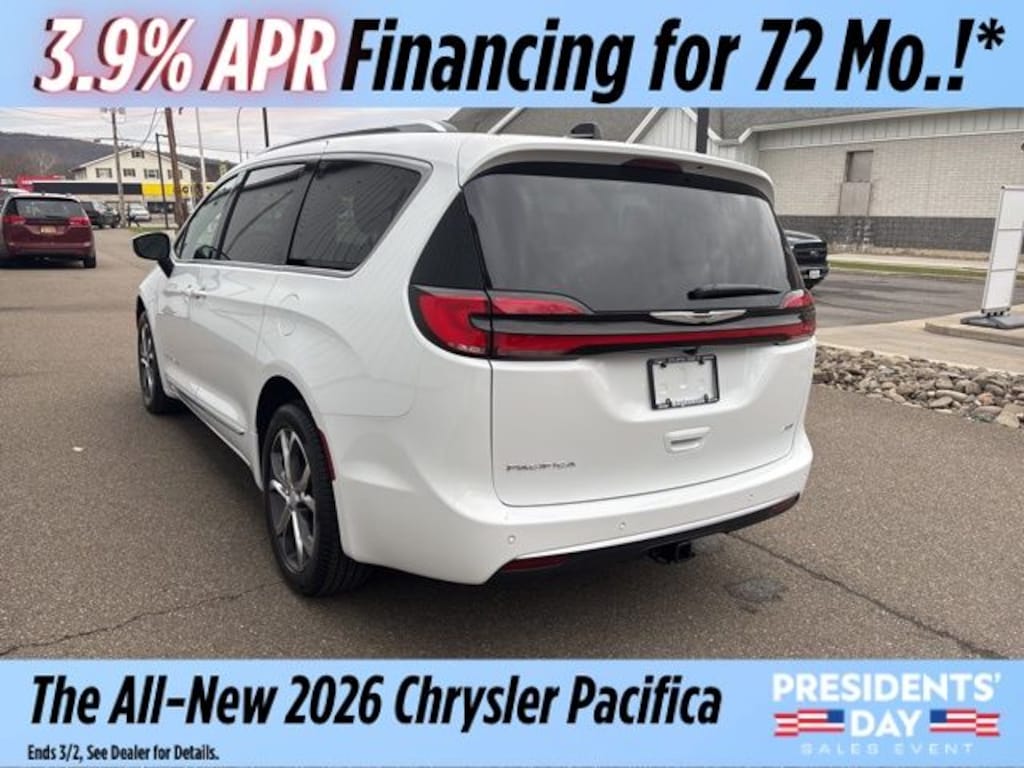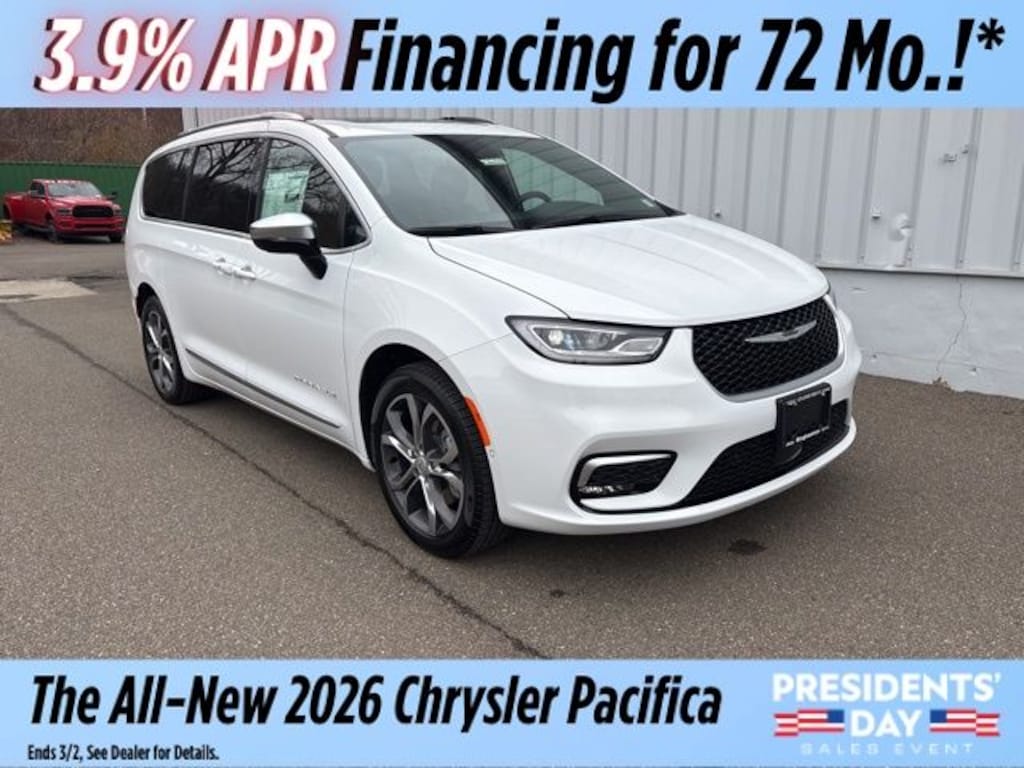 Bright White Clearcoat 2026 Chrysler Pacifica Pinnacle AWD 9-Speed 948TE Automatic 3.6L V6 24V VVT Save Time at the Dealership by Customizing your Deal Online!, 19 Speakers, 3.73 Axle Ratio, 3rd row seats: split-bench, 4-Wheel Disc Brakes, 7 and 4 Pin Trailer Tow Wiring Harness, A/V remote, ABS brakes, Air Conditioning, Alloy wheels, AM/FM radio: SiriusXM 360L, Apple CarPlay/Android Auto, Audio memory, Auto-dimming door mirrors, Auto-dimming Rear-View mirror, Automatic temperature control, AWD Suspension, Bodyside moldings, Brake assist, Bumpers: body-color, Compass, Delay-off headlights, Driver door bin, Driver vanity mirror, Dual front impact airbags, Dual front side impact airbags, Electronic Stability Control, Emergency communication system: Chrysler Connect, Engine Block Heater, Four wheel independent suspension, Front anti-roll bar, Front Bucket Seats, Front Center Armrest, Front dual zone A/C, Front fog lights, Front reading lights, Fully automatic headlights, Garage door transmitter, harman/kardon® Speakers, Headphones, Heated door mirrors, Heated front seats, Heated rear seats, Heated steering wheel, Hitch with 2" Receiver, Illuminated entry, Knee airbag, Low tire pressure warning, Lumbar Pillow, Memory seat, MyFlexCare Service Plan, Navigation System, Occupant sensing airbag, Outside temperature display, Overhead airbag, Overhead console, Panic alarm, ParkView Rear Back-Up Camera, Passenger door bin, Passenger vanity mirror, Power door mirrors, Power driver seat, Power Liftgate, Power moonroof, Power passenger seat, Power steering, Power windows, Premium Leather Trimmed Bucket Seats, Quick Order Package 27S, Radio data system, Radio: Uconnect 5 Nav with 10.1" Display, Rain sensing wipers, Rear air conditioning, Rear reading lights, Rear window defroster, Rear window wiper, Reclining 3rd row seat, Remote keyless entry, Roof rack, Security system, Sepia Seat Color, Speed control, Split folding rear seat, Spoiler, Steering wheel mounted audio controls, Tachometer, Telescoping steering wheel, Tilt steering wheel, Traction control, Trailer Sway Damping, Trailer Tow Group, Trip computer, Turn signal indicator mirrors, Variably intermittent wipers, Ventilated front seats, Voltmeter, Wheels: 20" x 7.5" Paint/Polish Aluminum Design 2.