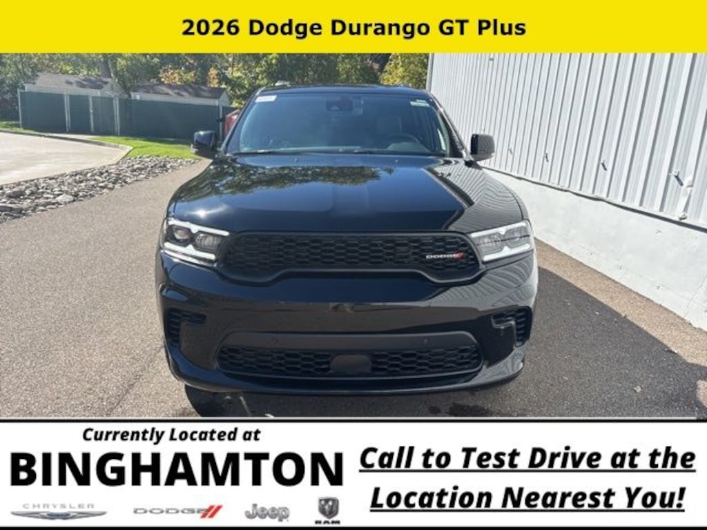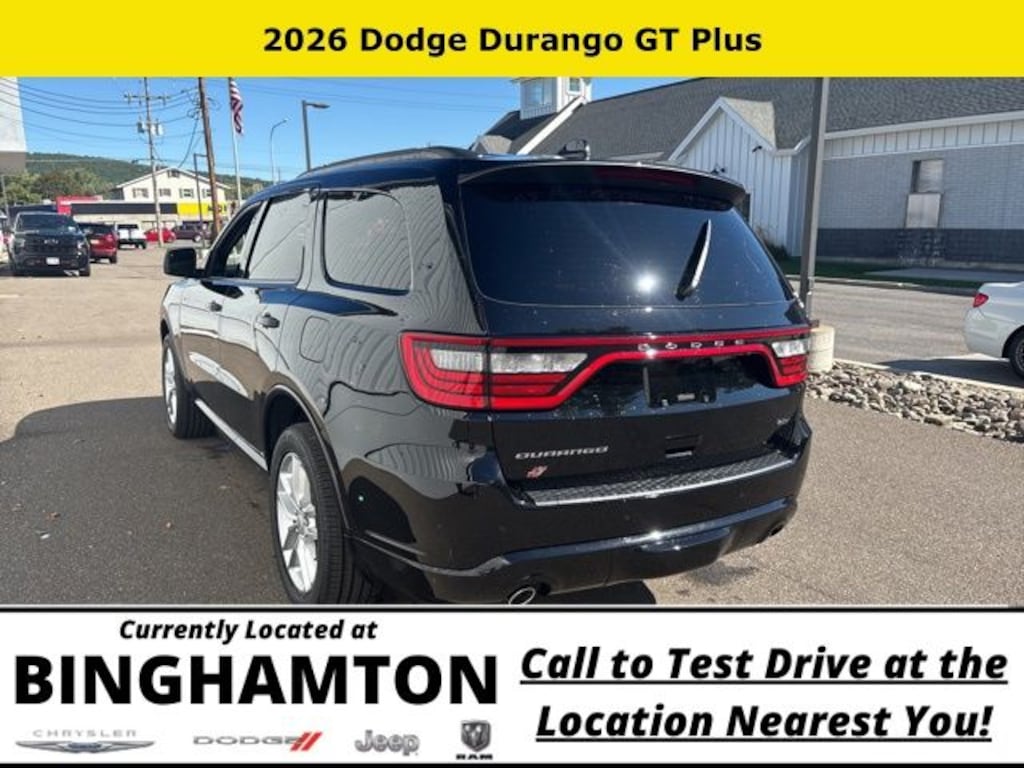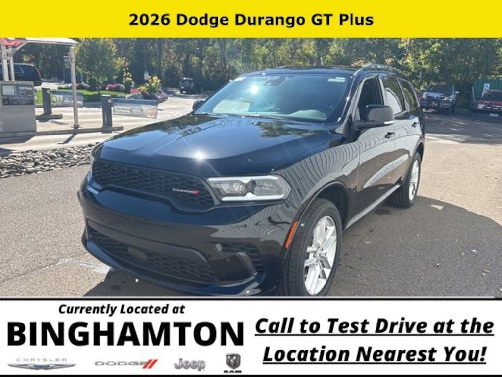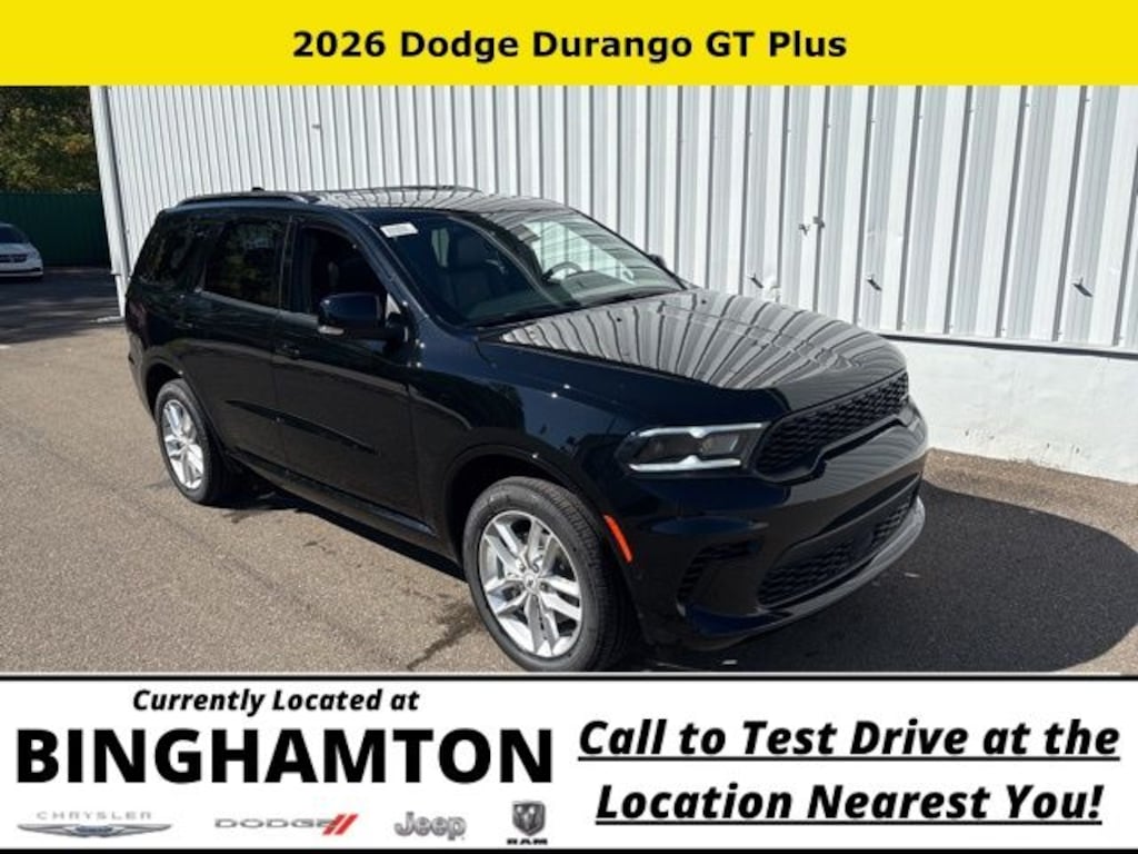 DB Black Crystal Clearcoat 2026 Dodge Durango GT Plus AWD 8-Speed Automatic 3.6L V6 24V VVT Save Time at the Dealership by Customizing your Deal Online!, AWD, 115V Auxiliary Power Outlet, 180 Amp Alternator, 2nd Row Fold/Tumble Captain Chairs, 2nd Row Mini Console w/Cupholders, 2nd Row Seat Mounted Inboard Armrests, 3.45 Rear Axle Ratio, 3rd Row Floor Mat & Mini Console, 3rd row seats: split-bench, 4-Wheel Disc Brakes, 506 Watt Amplifier, 6 Speakers, 6-Passenger Seating, 7 & 4 Pin Wiring Harness, 9 Alpine Amplified Speakers w/Subwoofer, ABS brakes, Adaptive Cruise Control w/Stop, Advanced Brake Assist, Air Conditioning, Alloy wheels, AM/FM radio: SiriusXM w/360L, Apple CarPlay/Android Auto, Auto High Beam Headlamp Control, Auto-Dimming Exterior Driver Mirror, Auto-dimming Rear-View mirror, Automatic temperature control, Black Roof Rails, Blind Spot w/Trailer Detection, Brake assist, Bright Cargo Area Scuff Pads, Bumpers: body-color, Class IV Receiver Hitch, Cloth Bucket Seats w/Shift Insert, Compass, Delay-off headlights, Driver door bin, Driver vanity mirror, Dual front impact airbags, Dual front side impact airbags, Dual Remote USB Port - Charge Only, Electronic Stability Control, Emergency communication system: Dodge Connect, Exterior Mirrors w/Heating Element, Exterior Mirrors w/Memory, Exterior Mirrors w/Supplemental Signals, Four wheel independent suspension, Front anti-roll bar, Front Bucket Seats, Front Center Armrest w/Storage, Front dual zone A/C, Front License Plate Bracket, Front reading lights, Full Speed Forward Collision Warning Plus, Fully automatic headlights, Garage door transmitter, Gloss Black Exterior Mirrors, Heated door mirrors, Heated front seats, Heated Second Row Seats, Heated steering wheel, Heavy-Duty Engine Cooling, Illuminated entry, Integrated Roof Rail Crossbars, Knee airbag, Lane Departure Warning Plus, Leather steering wheel, Leather Trimmed Bucket Seats, Leather Wrapped Door Panels, LED Auxiliary Low Beam & Turn Signal, Low tire pressure warning, Navigation System, Occupant sensing airbag, Outside temperature display, Overhead airbag, Overhead console, Panic alarm, ParkSense Front/Rear Park Assist w/Stop, ParkView Rear Back-Up Camera, Passenger door bin, Passenger vanity mirror, Power 6x9 Multi-Function Foldaway Mirrors, Power 8-Way Driver Memory 8-Way Passenger Seats, Power door mirrors, Power driver seat, Power Driver/Passenger 4-Way Lumbar Adjust, Power Liftgate, Power steering, Power Sunroof, Power Tilt & Telescopic Steering Column, Power windows, Quick Order Package 2BH GT Plus, Radio data system, Radio: Uconnect 5 Nav w/10.1" Display, Rear air conditioning, Rear anti-roll bar, Rear Load Leveling Suspension, Rear reading lights, Rear seat center armrest, Rear window defroster, Rear window wiper, Red Accent Stitching, Remote keyless entry, Security Alarm, Speed control, Speed-sensing steering, Speed-Sensitive Wipers, Split folding rear seat, Spoiler, Sport steering wheel, Steering wheel mounted audio controls, Sun Visors w/Illuminated Vanity Mirrors, Tachometer, Telescoping steering wheel, Tilt steering wheel, Traction control, Trailer Brake Control, Trip computer, Variably intermittent wipers, Ventilated Front Seats, Voltmeter, Wheels: 20" x 8" Fine Silver, Wireless Charging Pad, AWD.
