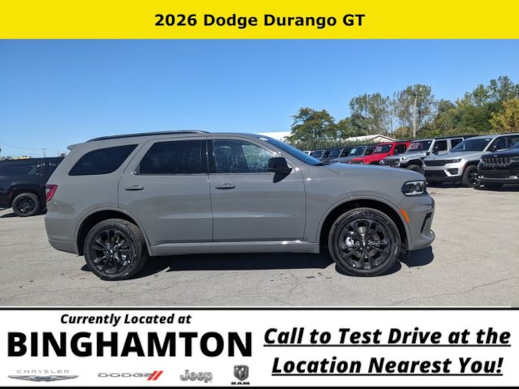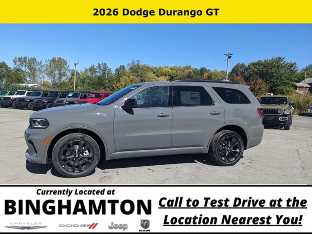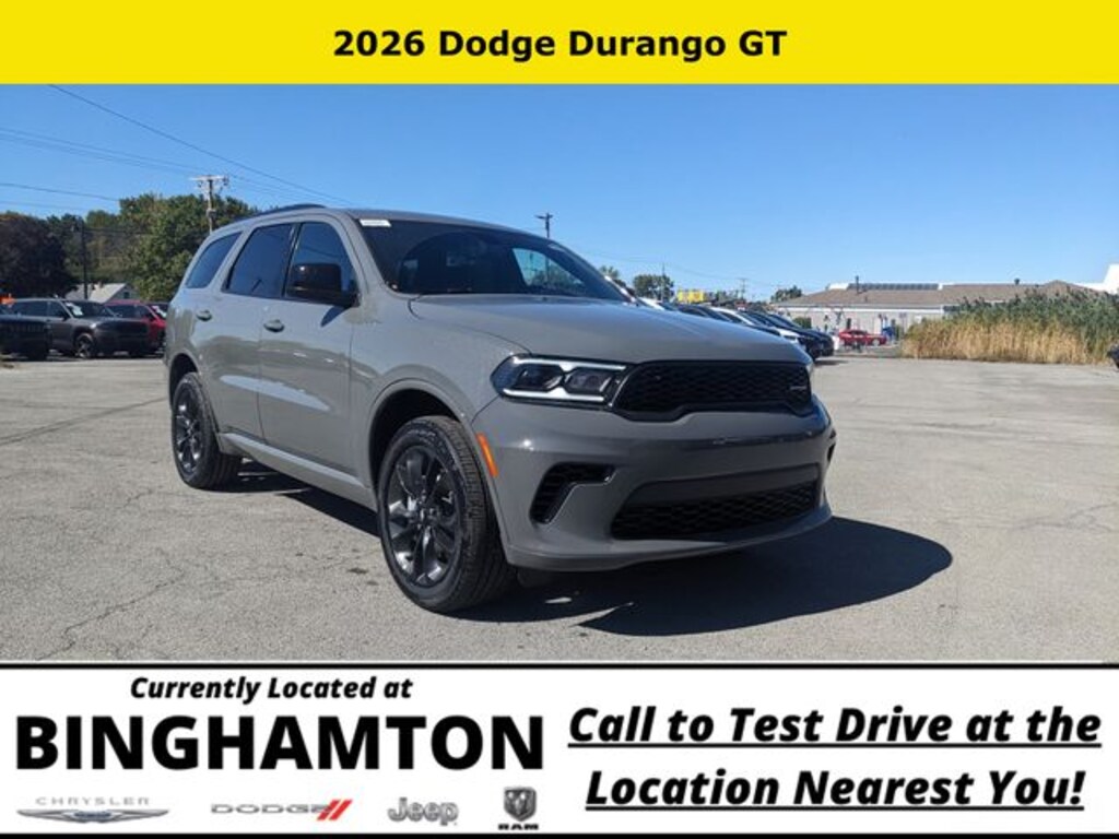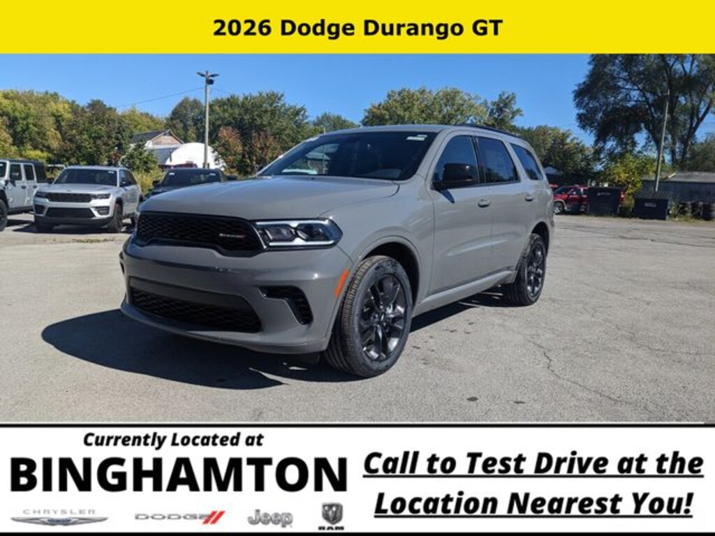 Destroyer Gray Clearcoat 2026 Dodge Durango GT AWD 8-Speed Automatic 3.6L V6 24V VVT Save Time at the Dealership by Customizing your Deal Online!, AWD, 3.45 Rear Axle Ratio, 3rd row seats: split-bench, 4-Wheel Disc Brakes, 6 Speakers, ABS brakes, Air Conditioning, Alloy wheels, AM/FM radio: SiriusXM w/360L, Apple CarPlay/Android Auto, Auto-dimming Rear-View mirror, Automatic temperature control, Black Roof Rails, Blacktop Package, Brake assist, Bumpers: body-color, Cloth Bucket Seats w/Shift Insert, Compass, Delay-off headlights, Driver door bin, Driver vanity mirror, Dual front impact airbags, Dual front side impact airbags, Electronic Stability Control, Emergency communication system: Dodge Connect, Exterior Mirrors w/Heating Element, Four wheel independent suspension, Front anti-roll bar, Front Bucket Seats, Front Center Armrest w/Storage, Front dual zone A/C, Front License Plate Bracket, Front reading lights, Fully automatic headlights, Garage door transmitter, Gloss Black Badges, Gloss Black Exterior Mirrors, GT Gloss Black Badging, Heated door mirrors, Heated front seats, Heated steering wheel, Illuminated entry, Integrated Roof Rail Crossbars, Knee airbag, Leather steering wheel, Low tire pressure warning, Navigation System, Occupant sensing airbag, Outside temperature display, Overhead airbag, Overhead console, Panic alarm, ParkView Rear Back-Up Camera, Passenger door bin, Passenger vanity mirror, Power door mirrors, Power driver seat, Power Liftgate, Power steering, Power windows, Quick Order Package 2BD GT, Radio data system, Radio: Uconnect 5 Nav w/10.1" Display, Rear air conditioning, Rear anti-roll bar, Rear reading lights, Rear seat center armrest, Rear window defroster, Rear window wiper, Red Accent Stitching, Remote keyless entry, Satin Black Dodge Tail Lamp Badge, Speed control, Speed-sensing steering, Speed-Sensitive Wipers, Split folding rear seat, Spoiler, Sport steering wheel, Steering wheel mounted audio controls, Tachometer, Telescoping steering wheel, Tilt steering wheel, Traction control, Trip computer, Variably intermittent wipers, Voltmeter, Wheels: 20" x 8" Black Noise Aluminum, Wheels: 20" x 8" Fine Silver, AWD.
