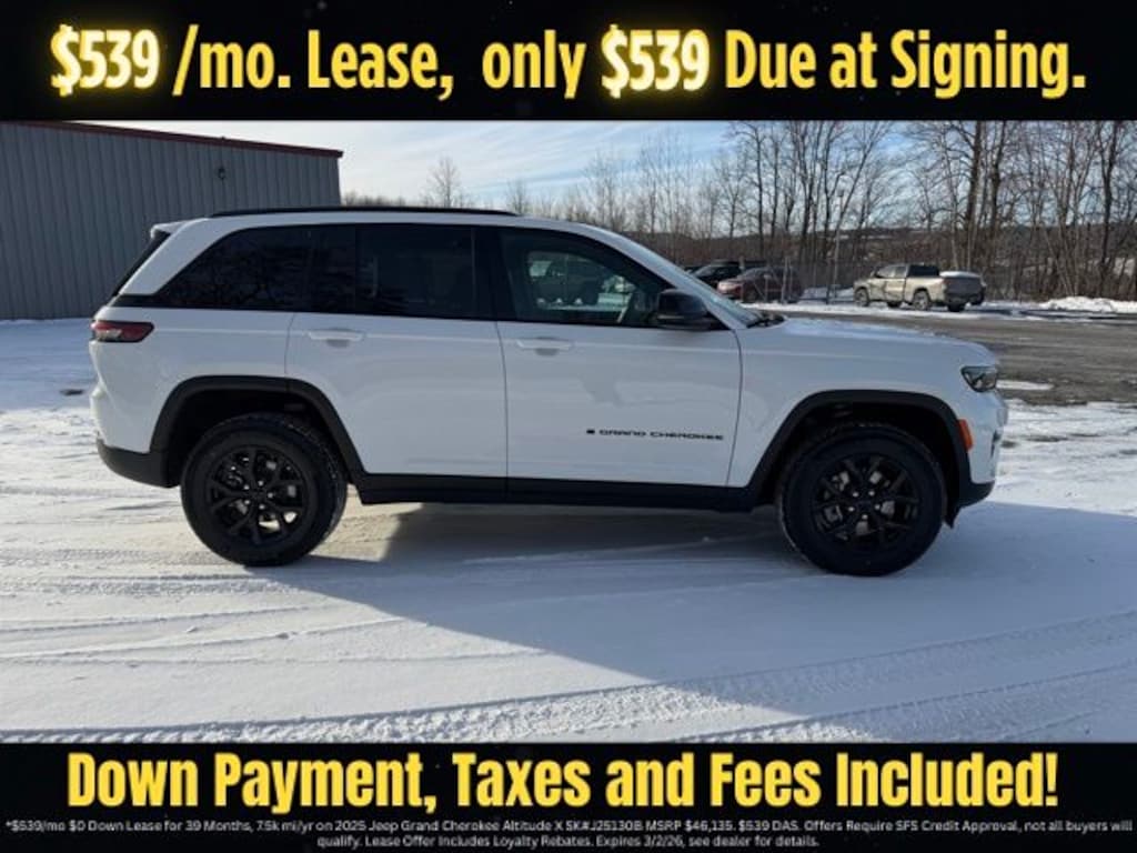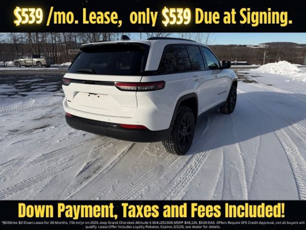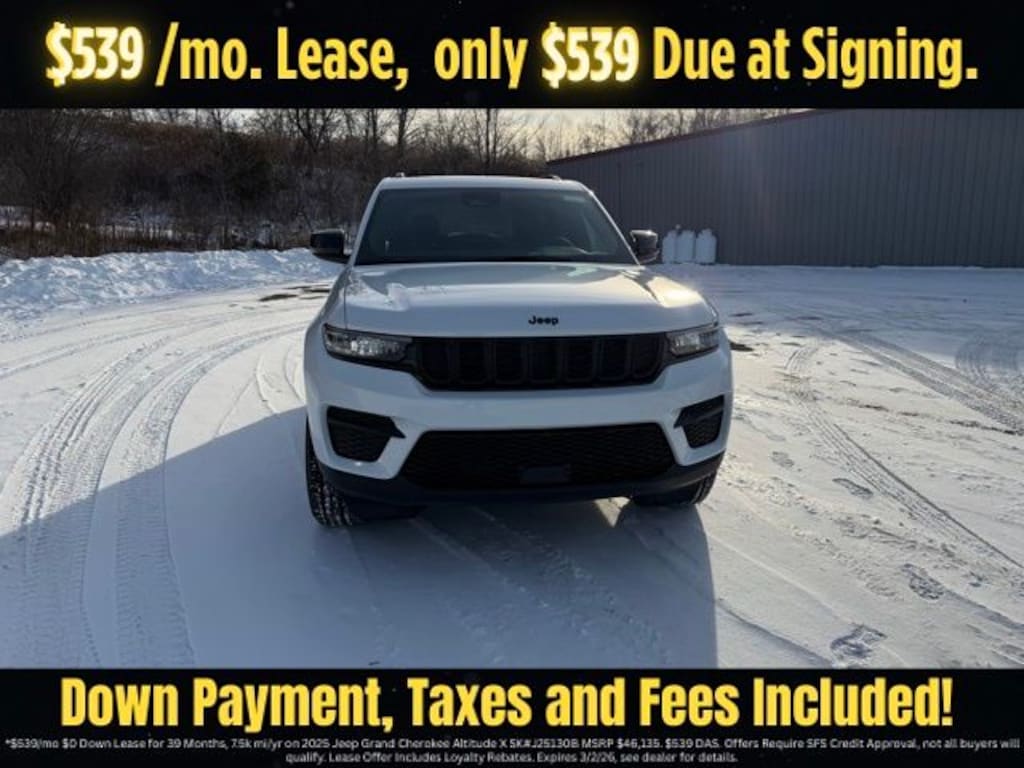 Bright White Clearcoat 2025 Jeep Grand Cherokee Altitude X 4WD 8-Speed Automatic 3.6L V6 24V VVT Save Time at the Dealership by Customizing your Deal Online!, 4WD, 115V Auxiliary Power Outlet, 4-Wheel Disc Brakes, 6 Speakers, ABS brakes, Air Conditioning, Alloy wheels, Altitude X, AM/FM radio: SiriusXM, Anti-whiplash front head restraints, Automatic temperature control, Black Headliner, Brake assist, Bumpers: body-color, Capri Leatherette/Suede Seats, Cloth Seats, Compass, Delay-off headlights, Delete Laredo Badge, Driver door bin, Driver vanity mirror, Dual front impact airbags, Dual front side impact airbags, Electronic Stability Control, Emergency communication system, Four wheel independent suspension, Front anti-roll bar, Front Bucket Seats, Front Center Armrest w/Storage, Front dual zone A/C, Front License Plate Bracket, Front reading lights, Fully automatic headlights, Gloss Black Exterior Accents, Heated door mirrors, Heated Front Seats, Heated Steering Wheel, Illuminated entry, Knee airbag, Low tire pressure warning, Model Year Tracking, Normal Duty Suspension, Occupant sensing airbag, Outside temperature display, Overhead airbag, Overhead console, Panic alarm, ParkView Rear Back-Up Camera, Passenger door bin, Passenger vanity mirror, Power door mirrors, Power driver seat, Power Liftgate, Power steering, Power Sunroof, Power windows, Quick Order Package 23M Altitude X, Radio data system, Radio: Uconnect 5 with 8.4" Display, Rain Sensitive Windshield Wipers, Rear anti-roll bar, Rear reading lights, Rear window defroster, Rear window wiper, Remote keyless entry, Remote Start System, Security system, Selectable Tire Fill Alert, Speed control, Speed-Sensitive Wipers, Split folding rear seat, Spoiler, Steering wheel mounted audio controls, Tachometer, Telescoping steering wheel, Tilt steering wheel, Traction control, Trip computer, Variably intermittent wipers, Voltmeter, Wheels: 17" x 6.5" Fully Painted Aluminum, Wheels: 18" x 8" Fully Painted Aluminum 1, Wireless Charging Pad, 4WD.