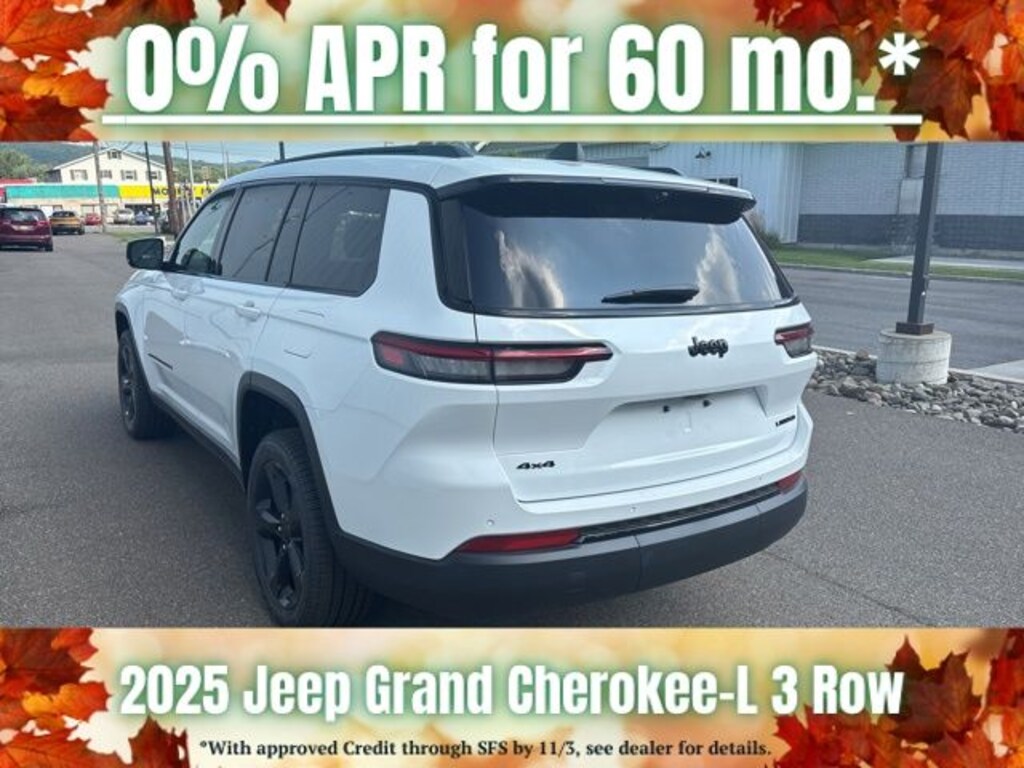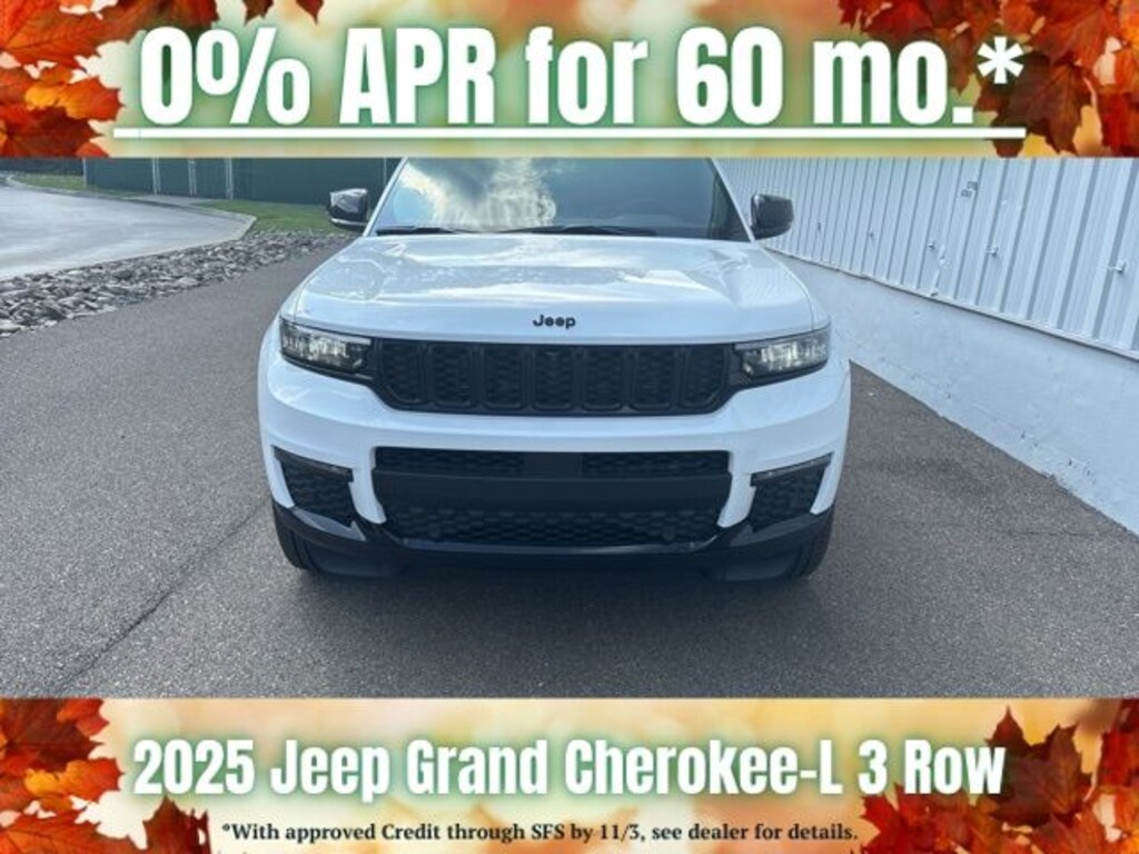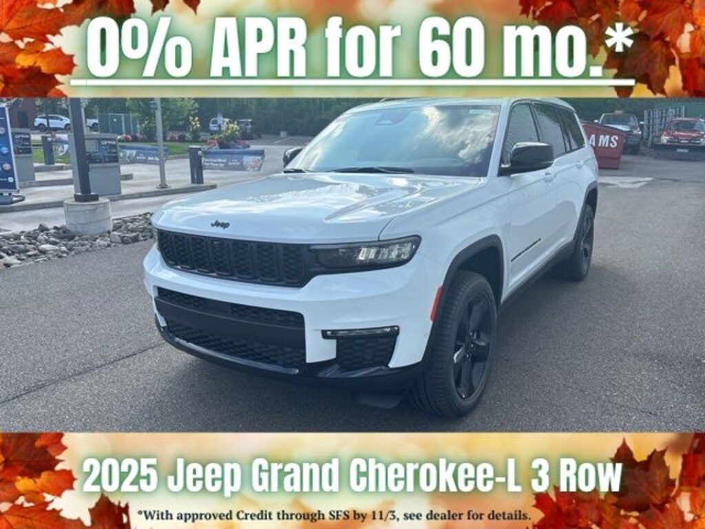 Bright White Clearcoat 2025 Jeep Grand Cherokee L Limited 4WD 8-Speed Automatic 3.6L V6 24V VVT Save Time at the Dealership by Customizing your Deal Online!, 2nd Row Manual Window Shades, 3.45 Rear Axle Ratio, 3rd row seats: split-bench, 4-Wheel Disc Brakes, 6 Speakers, ABS brakes, Active Noise Control System, Air Conditioning, Alloy wheels, AM/FM radio: SiriusXM with 360L, Anti-whiplash front head restraints, Audio memory, Auto High-beam Headlights, Auto-Dimming Exterior Driver Mirror, Automatic temperature control, Black Appearance Package, Brake assist, Bumpers: body-color, Capri Leatherette Seats, Capri Leatherette w/Axis II Seats, Compass, Delay-off headlights, Driver door bin, Driver vanity mirror, Dual front impact airbags, Dual front side impact airbags, Dual-Pane Panoramic Sunroof, Electronic Stability Control, Emergency communication system, Four wheel independent suspension, Front anti-roll bar, Front Bucket Seats, Front Center Armrest w/Storage, Front dual zone A/C, Front fog lights, Front License Plate Bracket, Front reading lights, Fully automatic headlights, Garage door transmitter, Gloss Black Exterior Accents, Heated door mirrors, Heated front seats, Heated rear seats, Heated steering wheel, Illuminated entry, Integrated Off-Road Camera, Interior Rear Facing Camera, Intersection Collision Assist System, Knee airbag, Low tire pressure warning, Luxury Tech Group II, Manual Fold Seatbacks, Memory seat, Memory Steering Column, Model Year Tracking, Navigation System, Normal Duty Suspension, Occupant sensing airbag, Outside temperature display, Overhead airbag, Overhead console, Panic alarm, ParkSense Front/Rear Park Assist w/Stop, ParkView Rear Back-Up Camera, Passenger door bin, Passenger vanity mirror, Passive Entry - Front/Rear Doors, Liftgate, Power door mirrors, Power driver seat, Power Liftgate, Power passenger seat, Power steering, Power Tilt/Telescope Steering Column, Power windows, Quick Order Package 22E, Radio data system, Radio: Uconnect 5 Nav w/10.1" Display, Rain Sensitive Windshield Wipers, Rear air conditioning, Rear anti-roll bar, Rear Back Up Camera Washer, Rear reading lights, Rear window defroster, Rear window wiper, Rearview Autodim Digital Display Mirror, Reclining 3rd row seat, Remote keyless entry, Security system, Speed control, Speed-Sensitive Wipers, Split folding rear seat, Spoiler, Steering wheel mounted audio controls, Surround View Camera System, Tachometer, Telescoping steering wheel, Tilt steering wheel, Traction control, Trip computer, Turn signal indicator mirrors, Variably intermittent wipers, Ventilated Front Seats, Voltmeter, Wheels: 18" x 8.0" Polished/Painted Aluminum, Wheels: 20" x 8.5" Gloss Black Painted Aluminum, Wireless Charging Pad.