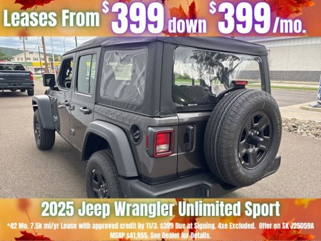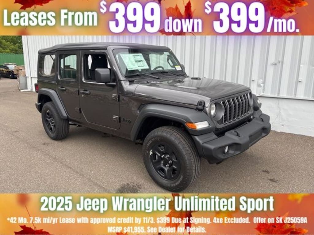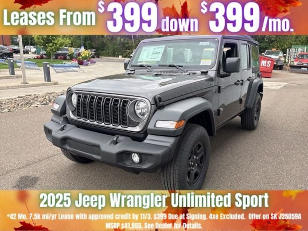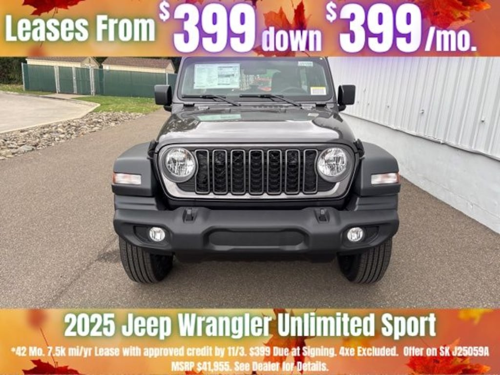 Granite Crystal Metallic Clearcoat 2025 Jeep Wrangler Sport 4WD 8-Speed Automatic 3.6L V6 24V VVT Save Time at the Dealership by Customizing your Deal Online!, 110 MPH Vehicle Max Speed Calibration, 3.45 Overall Top Gear Ratio, 4-Wheel Disc Brakes, 8 Speakers, ABS brakes, Air Conditioning, AM/FM radio: SiriusXM, Apple CarPlay/Android Auto, Aux Battery, Brake assist, Cloth Low-Back Bucket Seats, Compass, Delay-off headlights, Driver door bin, Driver vanity mirror, Dual front impact airbags, Dual front side impact airbags, Electronic Stability Control, Front anti-roll bar, Front Bucket Seats, Front Center Armrest w/Storage, Front fog lights, Front reading lights, Illuminated entry, Integrated roll-over protection, Low tire pressure warning, Non-Lock Fuel Cap w/o Discriminator, Normal Duty Suspension, Occupant sensing airbag, Outside temperature display, Overhead airbag, Panic alarm, ParkView Rear Back-Up Camera, Passenger door bin, Passenger vanity mirror, Power steering, Power windows, Quick Order Package 24B Sport, Radio data system, Radio: Uconnect 5 w/12.3" Display, Rear anti-roll bar, Rear reading lights, Remote keyless entry, Speed control, Split folding rear seat, Steering wheel mounted audio controls, Stop-Start Dual Battery System, Tachometer, Telescoping steering wheel, Tilt steering wheel, Traction control, Trip computer, Variably intermittent wipers, Wheels: 17" x 7.5" Black Steel Styled.