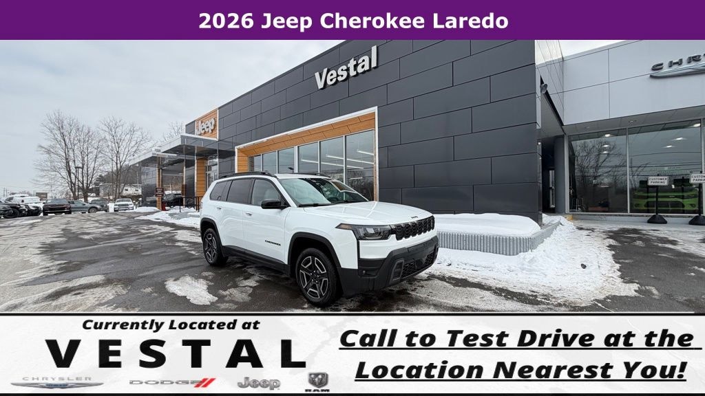 Bright White Clearcoat 2026 Jeep Cherokee Laredo 4WD CVT 1.6L I4 1.6L I4, 4-Wheel Disc Brakes, 4.16 Final Drive Ratio, 4G LTE Wi-Fi Hot Spot, 6 Speakers, ABS brakes, Air Conditioning, Alloy wheels, AM/FM radio: SiriusXM with 360L, Apple CarPlay, Apple CarPlay/Android Auto, Auto High-beam Headlights, Auto-Dimming Rear-View Mirror, Automatic temperature control, Bluetooth, Brake assist, Capri Leatherette Perforated Seats, Cognac Interior Stitching, Compass, Delay-off headlights, Driver door bin, Driver vanity mirror, Dual front impact airbags, Dual front side impact airbags, Electronic Stability Control, Emergency communication system, Exterior Mirrors Courtesy Lamps, Exterior Mirrors with Supplemental Signals, Four wheel independent suspension, Front anti-roll bar, Front Bucket Seats, Front Center Armrest, Front dual zone A/C, Front fog lights, Front License Plate Bracket, Front reading lights, Fully automatic headlights, Global Telematics Box Module (TBM), Gloss Black Mirrors, Google Android Auto, Heated door mirrors, Heated Exterior Mirrors, Heated front seats, Heated Steering Wheel, Illuminated entry, Knee airbag, Limited Badge, Low tire pressure warning, Occupant sensing airbag, Outside temperature display, Overhead airbag, Overhead console, Panic alarm, ParkView Rear Back-Up Camera, Passenger door bin, Passenger vanity mirror, Power 2-Way Passenger Lumbar Adjust, Power Adjust 6-Way Front Passenger Seat, Power door mirrors, Power driver seat, Power Liftgate, Power Multi-Function Foldaway Mirrors, Power steering, Power windows, Quick Order Package 23G Limited, Radio data system, Radio: Uconnect 5 with 12.3" Display, Rain sensing wipers, Rear anti-roll bar, Rear reading lights, Rear seat center armrest, Rear side impact airbag, Rear window defroster, Rear window wiper, Remote keyless entry, Security Alarm, SiriusXM with 360L, Soul Cloth Seats with Labyrinth Embossing, Speed control, Speed-sensing steering, Split folding rear seat, Spoiler, Steering wheel mounted audio controls, Tachometer, Telescoping steering wheel, Tilt steering wheel, Traction control, Trip computer, Universal Garage Door Opener, US/Canada Connectivity, Variably intermittent wipers, Wheels: 18" x 7" Machine Face Painted Aluminum, Wireless Charging Pad, 1.6L I4.