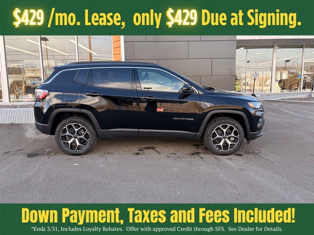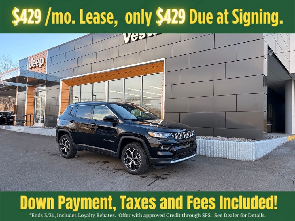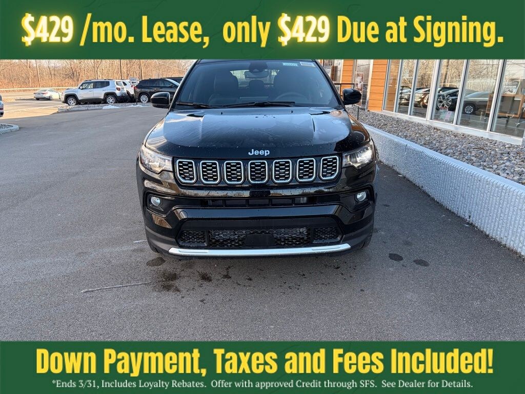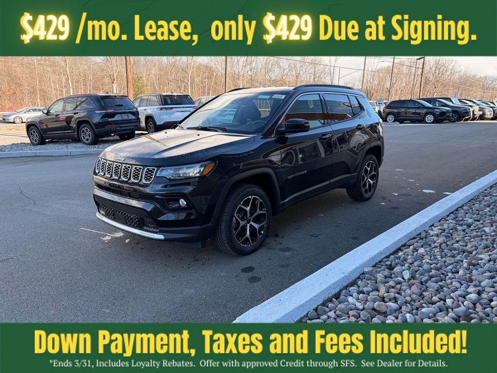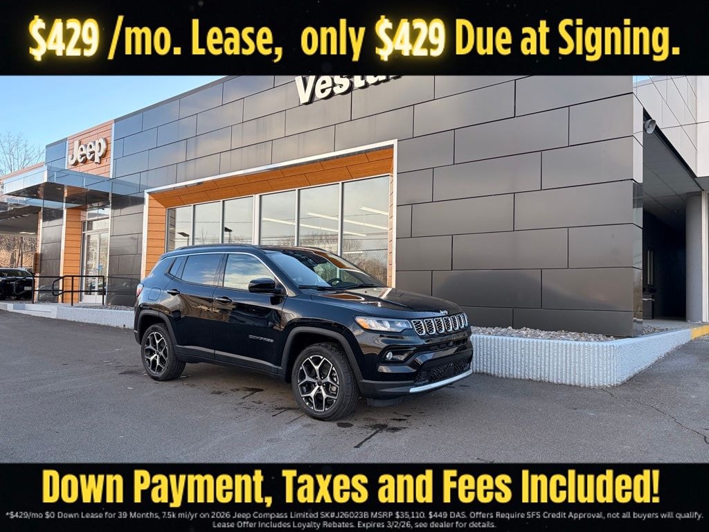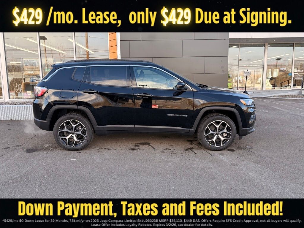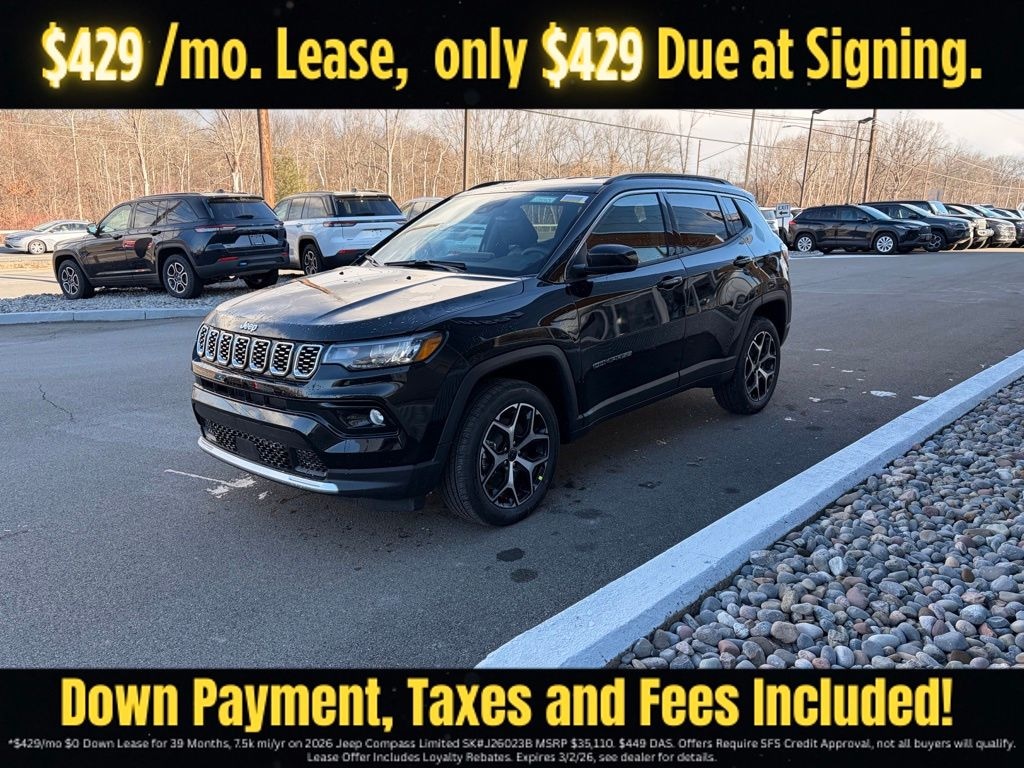 diamond black crystal pearlcoat 2026 Jeep Compass Limited 4WD 8-Speed Automatic 2.0L I4 DOHC 4WD, 10.1" Touchscreen Display, 3.73 Final Drive Ratio, 4-Wheel Disc Brakes, 4G LTE Wi-Fi Hot Spot, 6 Speakers, ABS brakes, Air Conditioning, Alloy wheels, AM/FM radio: SiriusXM, Auto High-beam Headlights, Auto-dimming Rear-View mirror, Automatic temperature control, Brake assist, Bumpers: body-color, Compass, Delay-off headlights, Driver door bin, Driver vanity mirror, Dual front impact airbags, Dual front side impact airbags, Electronic Stability Control, Emergency communication system: SiriusXM Guardian, Four wheel independent suspension, Front anti-roll bar, Front Bucket Seats, Front Center Armrest w/Storage, Front dual zone A/C, Front fog lights, Front License Plate Bracket, Front reading lights, Fully automatic headlights, Global Telematics Box Module, Heated door mirrors, Heated front seats, Heated steering wheel, Illuminated entry, Knee airbag, Leather Shift Knob, Leather steering wheel, Leatherette Seats, Low tire pressure warning, Occupant sensing airbag, Outside temperature display, Overhead airbag, Overhead console, Panic alarm, ParkView Rear Back-Up Camera, Passenger door bin, Passenger vanity mirror, Power door mirrors, Power driver seat, Power Liftgate, Power steering, Power windows, Premium audio system: UConnect 5, Quick Order Package 29G Limited, Radio: Uconnect 5 with 10.1" Display, Rain sensing wipers, Rear anti-roll bar, Rear seat center armrest, Rear window defroster, Rear window wiper, Remote keyless entry, Security system, SiriusXM Guardian - Included Trail (B), SiriusXM Radio Service, Speed control, Split folding rear seat, Spoiler, Steering wheel mounted audio controls, Tachometer, Telescoping steering wheel, Tilt steering wheel, Traction control, Trip computer, Turn signal indicator mirrors, Variably intermittent wipers, Wheels: 18" x 7" Painted Diamond Cut Aluminum, 4WD.