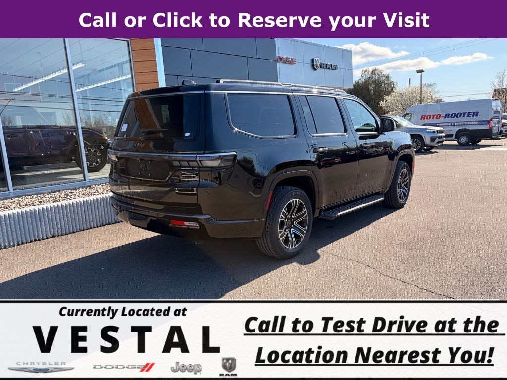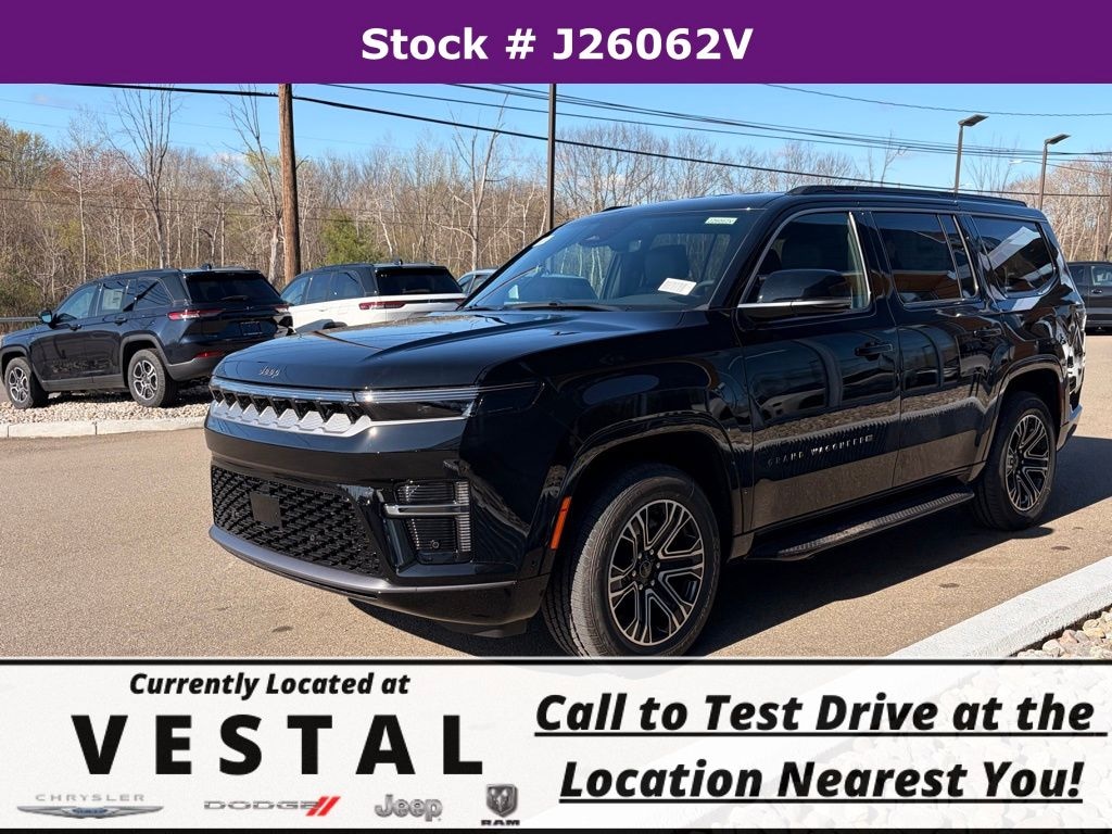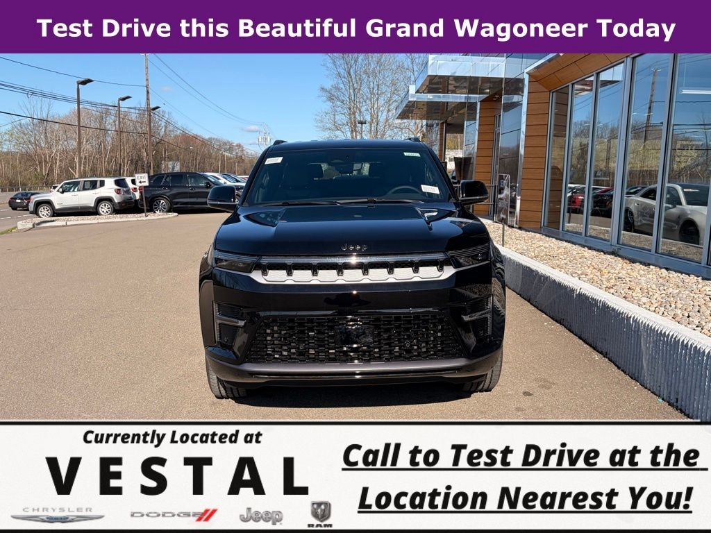 High Gloss Black 2026 Jeep Grand Wagoneer 4WD 8-Speed Automatic 3.0L I6 118 Mph Maximum Speed Calibration, 3.55 Rear Axle Ratio, 3rd row seats: bench, 4-Wheel Disc Brakes, 9 Speakers, ABS brakes, Air Conditioning, Alloy wheels, AM/FM radio: SiriusXM with 360L, Anti-whiplash front head restraints, Apple CarPlay/Android Auto, Audio memory, Auto Adjust in Reverse Exterior Mirrors, Auto High-beam Headlights, Auto-dimming door mirrors, Auto-Dimming Exterior Driver Mirror, Auto-dimming Rear-View mirror, Auto-leveling suspension, Automatic temperature control, Black Exterior Accents, Bluetooth, Brake assist, Bumpers: body-color, Compass, Delay-off headlights, Driver door bin, Driver vanity mirror, Driver's Seat Mounted Armrest, Dual front impact airbags, Dual front side impact airbags, Electronic Stability Control, Emergency communication system: Jeep Connect, Exterior Mirrors Approach Lamps, Exterior Mirrors with Memory, Exterior Mirrors with Supplemental Signals, Exterior Parking Camera Rear, Four wheel independent suspension, Front anti-roll bar, Front Bucket Seats, Front Center Armrest w/Storage, Front dual zone A/C, Front fog lights, Front reading lights, Fully automatic headlights, Garage door transmitter, Heated door mirrors, Heated Exterior Mirrors, Heated front seats, Heated steering wheel, Illuminated entry, Knee airbag, Low tire pressure warning, Memory seat, MyFlexCare Service Plan, Navigation System, Normal Duty Suspension, Occupant sensing airbag, Outside temperature display, Overhead airbag, Overhead console, Panic alarm, Passenger door bin, Passenger seat mounted armrest, Passenger vanity mirror, Power door mirrors, Power driver seat, Power Liftgate, Power passenger seat, Power steering, Power windows, Quick Order Package 29E Grand Wagoneer, Radio data system, Radio: Uconnect 5 Nav with 12.0" Display, Rain sensing wipers, Rear air conditioning, Rear anti-roll bar, Rear reading lights, Rear seat center armrest, Rear window defroster, Rear window wiper, Reclining 3rd row seat, Remote keyless entry, Security system, Speed control, Speed-sensing steering, Speed-Sensitive Wipers, Split folding rear seat, Steering wheel memory, Steering wheel mounted audio controls, Tachometer, Telescoping steering wheel, Tilt steering wheel, Traction control, Trip computer, Turn signal indicator mirrors, Variably intermittent wipers, Ventilated front seats, Wheels: 20" x 9" Machine Face Painted Aluminum.