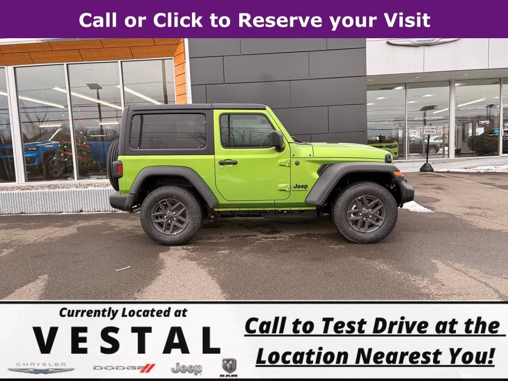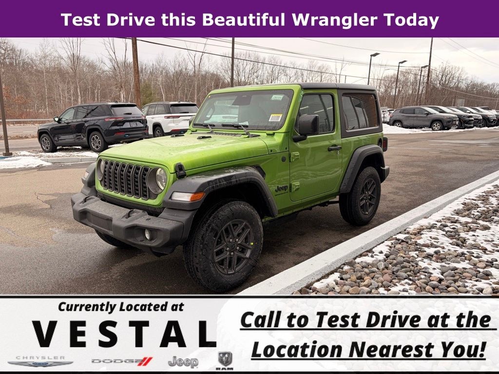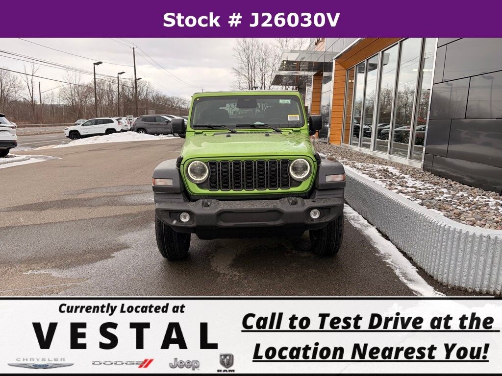 mojito clearcoat 2026 Jeep Wrangler Sport S 4WD 8-Speed Automatic 2.0L I4 DOHC 12.3" Touchscreen Display, 2-Door Passive Entry, Front Door Locks, 3.45 Overall Top Gear Ratio, 4-Wheel Disc Brakes, 4G LTE Wi-Fi Hot Spot, 8 Speakers, ABS brakes, Advanced Brake Assist, Air Conditioning, Air Conditioning with Auto Temp Control, Air Filtering, AM/FM radio: SiriusXM with 360L, Apple CarPlay, Apple CarPlay/Android Auto, Automatic Headlamps, Aux Battery, Black 3-Piece Hard Top, Brake assist, Cloth Low-Back Bucket Seats, Cluster 7.0" TFT Color Display, Compass, Connectivity - US/Canada, Convenience Group, Corning Gorilla Glass, Deep Tint Sunscreen Windows, Delay-off headlights, Driver door bin, Driver vanity mirror, Dual front impact airbags, Dual front side impact airbags, Electronic Stability Control, Emergency/Assistance Call, Enhanced Adaptive Cruise Control, For More Info, Call 800-643-2112, Freedom Panel Storage Bag, Front anti-roll bar, Front Bucket Seats, Front Center Armrest w/Storage, Front fog lights, Front LED Fog Lamps, Front reading lights, Full Speed Forward Collision Warning Plus, Google Android Auto, Heated Front Seats, Heated Steering Wheel, Illuminated entry, Integrated Center Stack Radio, Integrated roll-over protection, LED Headlamp and Fog Lamp Group, LED Premium Reflector Headlamps, Low tire pressure warning, Non-Lock Fuel Cap Without Discriminator, Normal Duty Suspension, Occupant sensing airbag, Outside temperature display, Overhead airbag, Panic alarm, ParkView Rear Back-Up Camera, Passenger door bin, Passenger vanity mirror, Power Heated Mirrors, Power steering, Power windows, Premium Wrapped Steering Wheel, Quick Order Package 22S Sport S, Radio data system, Radio: Uconnect 5 with 12.3" Display, Rear anti-roll bar, Rear reading lights, Rear Window Defroster, Rear Window Wiper/Washer, Remote keyless entry, Security Alarm, SiriusXM Radio Service, SiriusXM with 360L, Speed control, Steering wheel mounted audio controls, Stop-Start Dual Battery System, Sun Visors with Illuminated Vanity Mirrors, Tachometer, Telescoping steering wheel, Tilt steering wheel, Traction control, Trip computer, Universal Garage Door Opener, Variably intermittent wipers, Wheels: 17" x 7.5" Black Steel Styled, Wheels: 17" x 7.5" Gray.