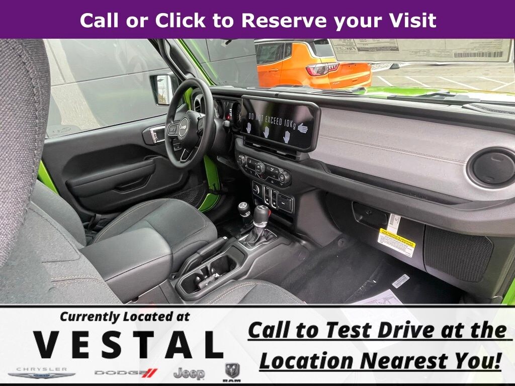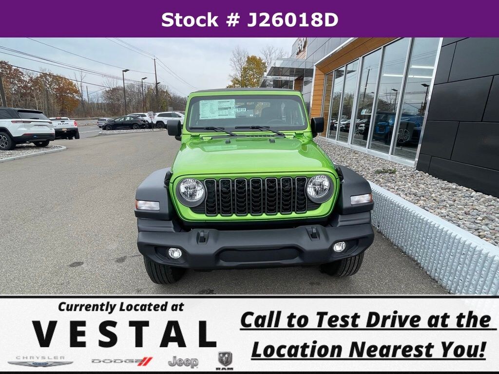 Mojito Clearcoat 2026 Jeep Wrangler Sport 4WD 8-Speed Automatic 2.0L I4 DOHC 3.45 Overall Top Gear Ratio, 4-Wheel Disc Brakes, 8 Speakers, ABS brakes, Air Conditioning, AM/FM radio: SiriusXM with 360L, Apple CarPlay/Android Auto, Aux Battery, Brake assist, Cloth Low-Back Bucket Seats, Compass, Delay-off headlights, Driver door bin, Driver vanity mirror, Dual front impact airbags, Dual front side impact airbags, Electronic Stability Control, Front anti-roll bar, Front Bucket Seats, Front Center Armrest w/Storage, Front fog lights, Front reading lights, Illuminated entry, Integrated roll-over protection, Low tire pressure warning, Non-Lock Fuel Cap w/o Discriminator, Normal Duty Suspension, Occupant sensing airbag, Outside temperature display, Overhead airbag, Panic alarm, ParkView Rear Back-Up Camera, Passenger door bin, Passenger vanity mirror, Power steering, Power windows, Quick Order Package 22B Sport, Radio data system, Radio: Uconnect 5 w/12.3" Display, Rear anti-roll bar, Rear reading lights, Remote keyless entry, Speed control, Steering wheel mounted audio controls, Stop-Start Dual Battery System, Tachometer, Telescoping steering wheel, Tilt steering wheel, Traction control, Trip computer, Variably intermittent wipers, Wheels: 17" x 7.5" Black Steel Styled.