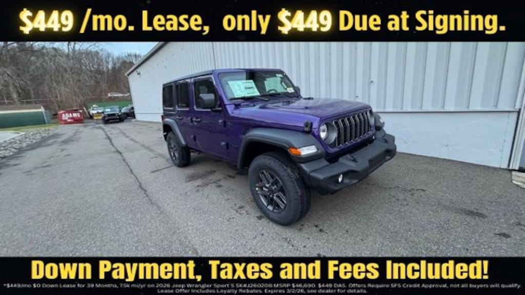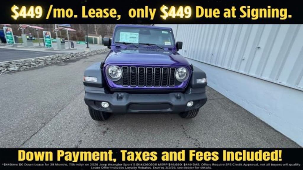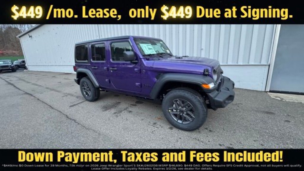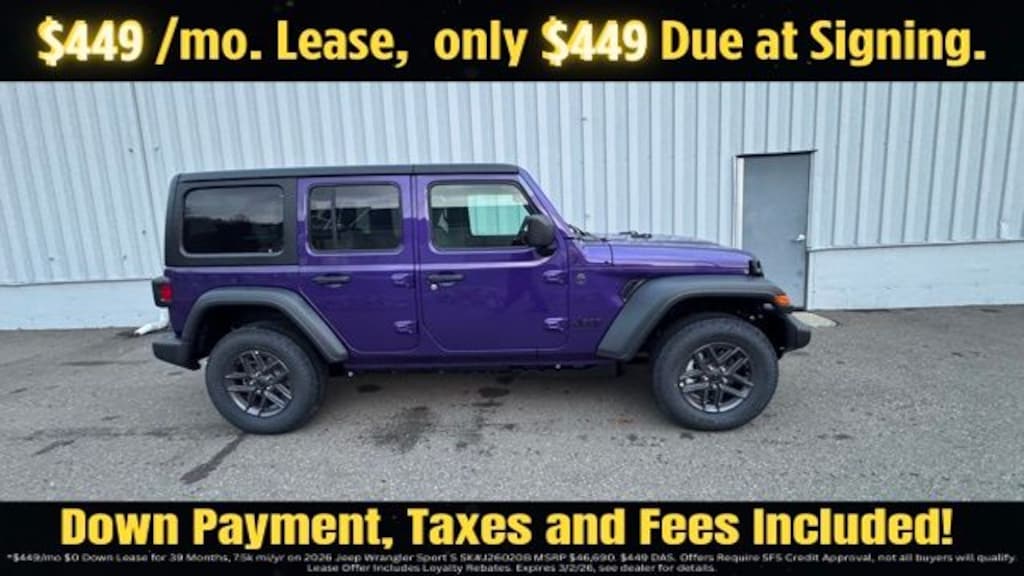 Reign 2026 Jeep Wrangler Sport S 4DR 4x4 4WD 8-Speed Automatic 2.0L I4 DOHC Save Time at the Dealership by Customizing your Deal Online!, 12.3" Touchscreen Display, 2-Door Passive Entry, Front Door Locks, 3.45 Overall Top Gear Ratio, 4-Wheel Disc Brakes, 4G LTE Wi-Fi Hot Spot, 8 Speakers, ABS brakes, Advanced Brake Assist, Air Conditioning, Air Conditioning with Auto Temp Control, Air Filtering, AM/FM radio: SiriusXM with 360L, Apple CarPlay, Apple CarPlay/Android Auto, Automatic Headlamps, Aux Battery, Black 3-Piece Hard Top, Brake assist, Cloth Low-Back Bucket Seats, Cluster 7.0" TFT Color Display, Compass, Connectivity - US/Canada, Convenience Group, Corning Gorilla Glass, Deep Tint Sunscreen Windows, Delay-off headlights, Driver door bin, Driver vanity mirror, Dual front impact airbags, Dual front side impact airbags, Electronic Stability Control, Emergency/Assistance Call, Enhanced Adaptive Cruise Control, For More Info, Call 800-643-2112, Freedom Panel Storage Bag, Front anti-roll bar, Front Bucket Seats, Front Center Armrest w/Storage, Front fog lights, Front reading lights, Full Speed Forward Collision Warning Plus, Google Android Auto, Heated Front Seats, Heated Steering Wheel, Illuminated entry, Integrated Center Stack Radio, Integrated roll-over protection, Low tire pressure warning, Non-Lock Fuel Cap Without Discriminator, Normal Duty Suspension, Occupant sensing airbag, Outside temperature display, Overhead airbag, Panic alarm, ParkView Rear Back-Up Camera, Passenger door bin, Passenger vanity mirror, Power Heated Mirrors, Power steering, Power windows, Premium Wrapped Steering Wheel, Quick Order Package 22S Sport S, Radio data system, Radio: Uconnect 5 with 12.3" Display, Rear anti-roll bar, Rear reading lights, Rear Window Defroster, Rear Window Wiper/Washer, Remote keyless entry, Security Alarm, SiriusXM Radio Service, SiriusXM with 360L, Speed control, Split folding rear seat, Steering wheel mounted audio controls, Stop-Start Dual Battery System, Sun Visors with Illuminated Vanity Mirrors, Tachometer, Telescoping steering wheel, Tilt steering wheel, Traction control, Trip computer, Universal Garage Door Opener, Variably intermittent wipers, Wheels: 17" x 7.5" Black Steel Styled, Wheels: 17" x 7.5" Gray.