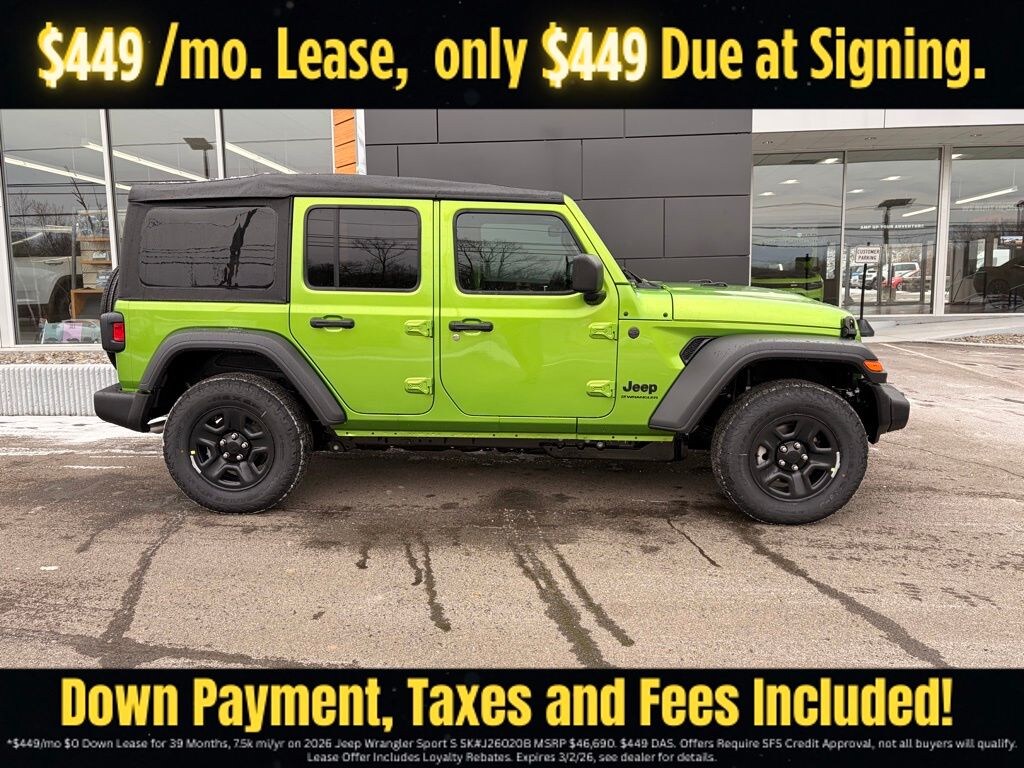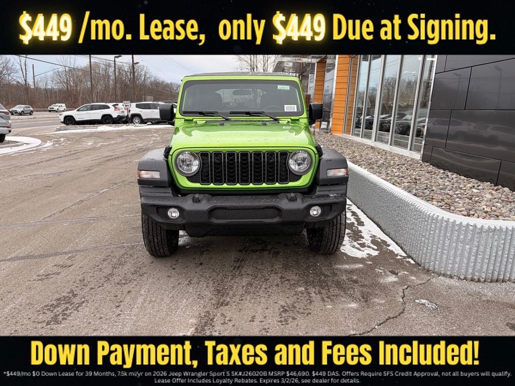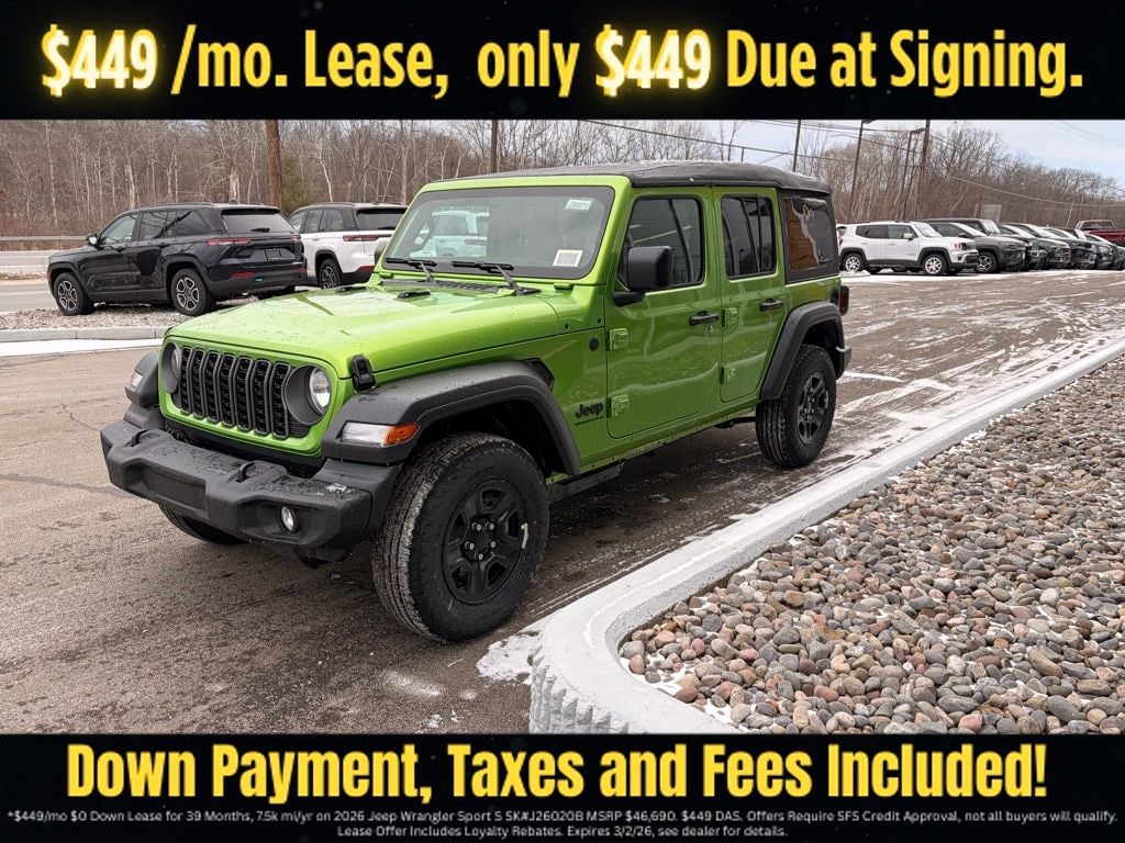 Mojito Clearcoat 2026 Jeep Wrangler Sport 4DR 4x4 4WD 8-Speed Automatic 3.6L V6 24V VVT 12.3" Touchscreen Display, 3.45 Overall Top Gear Ratio, 4-Wheel Disc Brakes, 4G LTE Wi-Fi Hot Spot, 8 Speakers, ABS brakes, Air Conditioning, AM/FM radio: SiriusXM with 360L, Apple CarPlay, Apple CarPlay/Android Auto, Aux Battery, Brake assist, Cloth Low-Back Bucket Seats, Compass, Connectivity - US/Canada, Deep Tint Sunscreen Windows, Delay-off headlights, Driver door bin, Driver vanity mirror, Dual front impact airbags, Dual front side impact airbags, Electronic Stability Control, For More Info, Call 800-643-2112, Front anti-roll bar, Front Bucket Seats, Front Center Armrest w/Storage, Front fog lights, Front reading lights, Google Android Auto, Illuminated entry, Integrated Center Stack Radio, Integrated roll-over protection, Low tire pressure warning, MOPAR All-Weather Floor Mats, Non-Lock Fuel Cap Without Discriminator, Normal Duty Suspension, Occupant sensing airbag, Outside temperature display, Overhead airbag, Panic alarm, ParkView Rear Back-Up Camera, Passenger door bin, Passenger vanity mirror, Power steering, Power windows, Quick Order Package 24B Sport, Radio data system, Radio: Uconnect 5 with 12.3" Display, Rear anti-roll bar, Rear reading lights, Remote keyless entry, SiriusXM Radio Service, SiriusXM with 360L, Speed control, Split folding rear seat, Steering wheel mounted audio controls, Stop-Start Dual Battery System, Tachometer, Telescoping steering wheel, Tilt steering wheel, Traction control, Trip computer, Variably intermittent wipers, Wheels: 17" x 7.5" Black Steel Styled.
