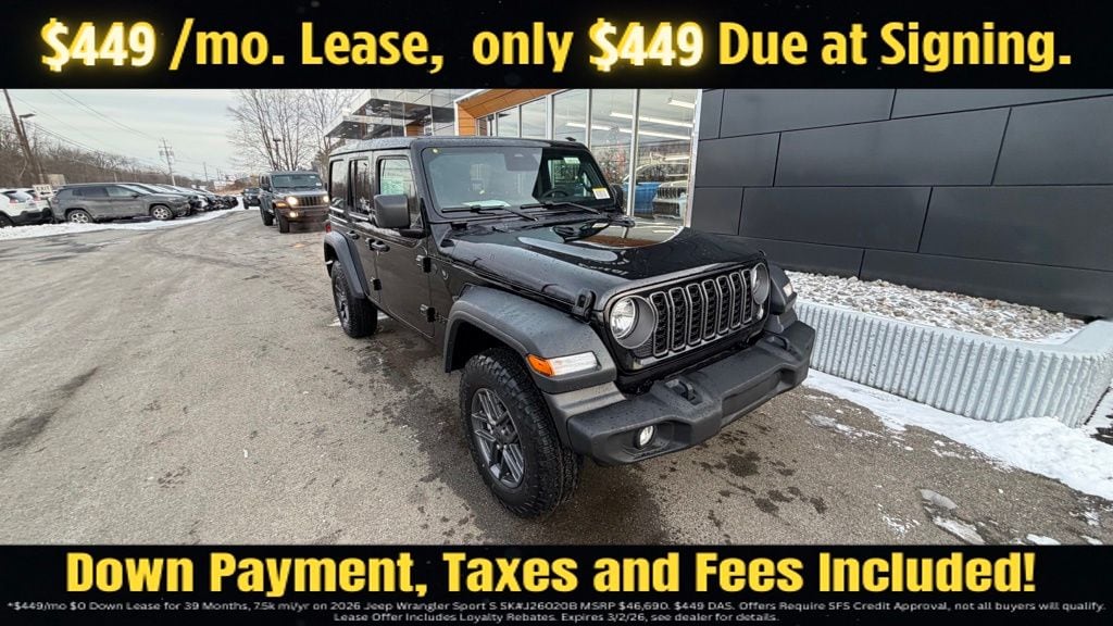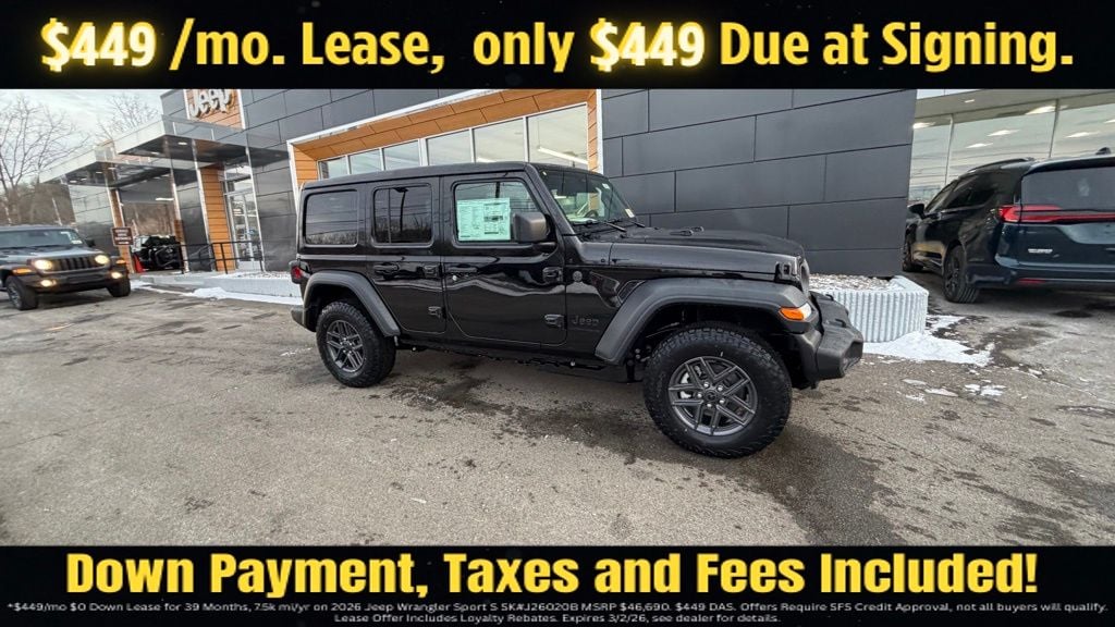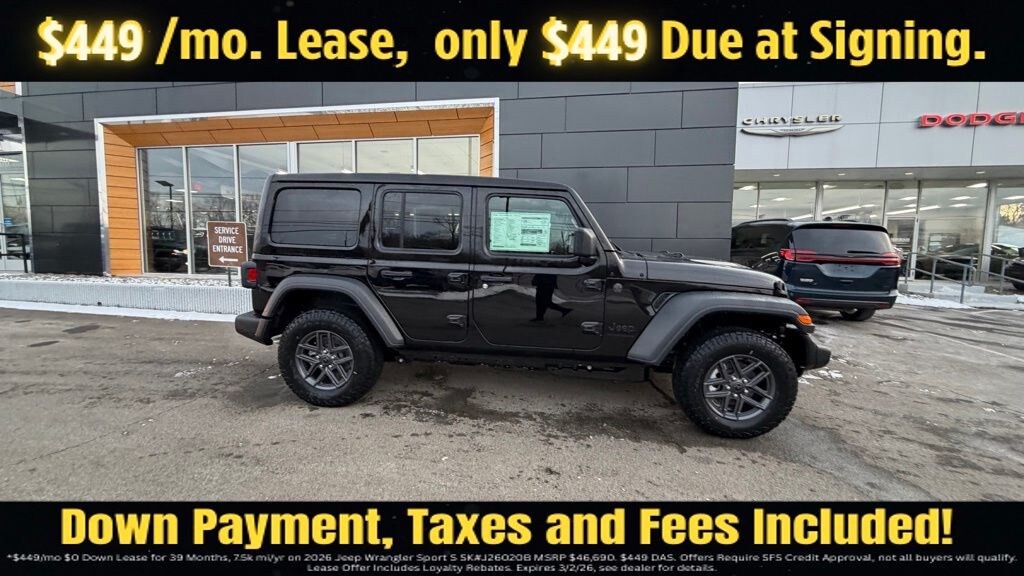 Black Clearcoat 2026 Jeep Wrangler Sport S 4WD 8-Speed Automatic 3.6L V6 24V VVT 12.3" Touchscreen Display, 2-Door Passive Entry, Front Door Locks, 3.45 Overall Top Gear Ratio, 4-Wheel Disc Brakes, 4G LTE Wi-Fi Hot Spot, 8 Speakers, ABS brakes, Advanced Brake Assist, Air Conditioning, Air Conditioning with Auto Temp Control, Air Filtering, AM/FM radio: SiriusXM with 360L, Apple CarPlay, Apple CarPlay/Android Auto, Automatic Headlamps, Aux Battery, Brake assist, Cluster 7.0" TFT Color Display, Compass, Connectivity - US/Canada, Convenience Group, Corning Gorilla Glass, Deep Tint Sunscreen Windows, Delay-off headlights, Driver door bin, Driver vanity mirror, Dual front impact airbags, Dual front side impact airbags, Electronic Stability Control, Emergency/Assistance Call, Enhanced Adaptive Cruise Control, For More Info, Call 800-643-2112, Front anti-roll bar, Front Bucket Seats, Front Center Armrest w/Storage, Front fog lights, Front reading lights, Full Speed Forward Collision Warning Plus, Google Android Auto, Heated Front Seats, Heated Steering Wheel, Illuminated entry, Integrated Center Stack Radio, Integrated roll-over protection, Low tire pressure warning, MOPAR All-Weather Floor Mats, Non-Lock Fuel Cap Without Discriminator, Normal Duty Suspension, Occupant sensing airbag, Outside temperature display, Overhead airbag, Panic alarm, ParkView Rear Back-Up Camera, Passenger door bin, Passenger vanity mirror, Power Heated Mirrors, Power steering, Power Top Quarter Window Storage Bag, Power windows, Premium Wrapped Steering Wheel, Quick Order Package 24S Sport S, Radio data system, Radio: Uconnect 5 with 12.3" Display, Rear anti-roll bar, Rear reading lights, Rear Window Defroster, Rear Window Wiper/Washer, Remote keyless entry, Removable Rear Quarter Windows, Security Alarm, SiriusXM Radio Service, SiriusXM with 360L, Sky One-Touch Power Top, Speed control, Split folding rear seat, Steering wheel mounted audio controls, Stop-Start Dual Battery System, Sun Visors with Illuminated Vanity Mirrors, Tachometer, Telescoping steering wheel, Tilt steering wheel, Traction control, Trip computer, Universal Garage Door Opener, Variably intermittent wipers, Wheels: 17" x 7.5" Black Steel Styled, Wheels: 17" x 7.5" Gray.