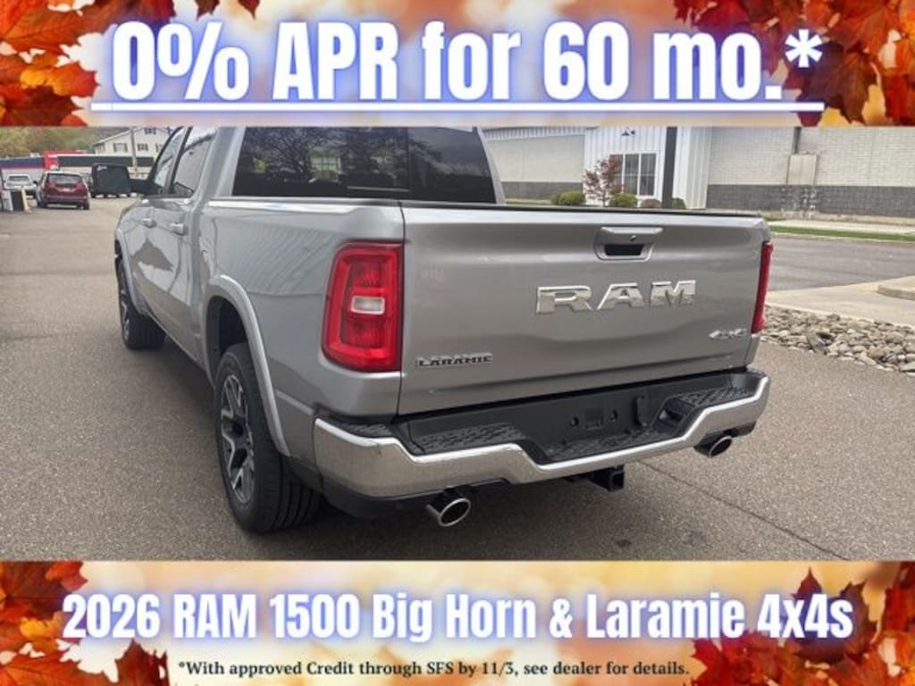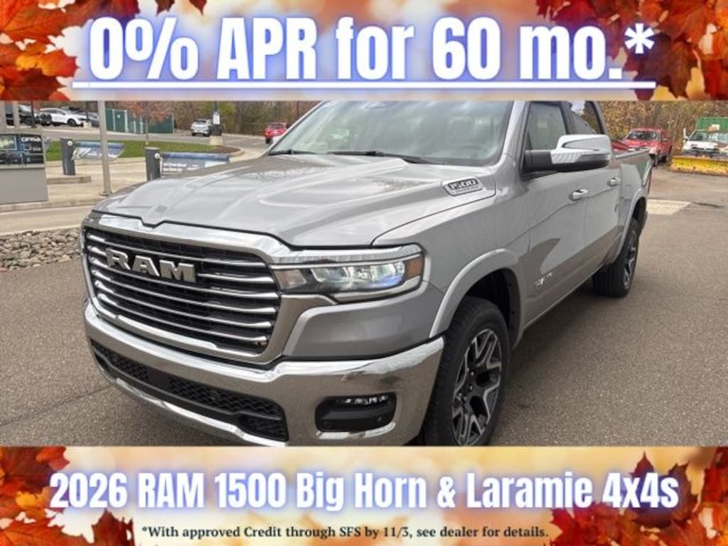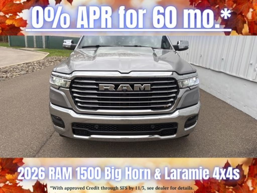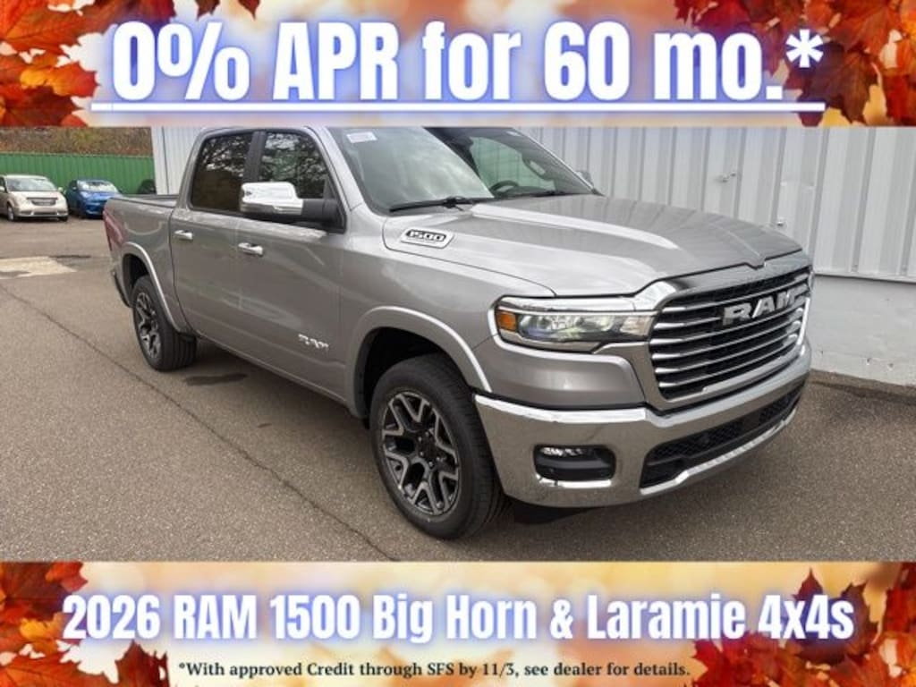 Billet Silver Metallic Clearcoat 2026 Ram 1500 Laramie 4WD 8-Speed Automatic 3.0L I6 Save Time at the Dealership by Customizing your Deal Online!, 10 Speakers, 3.55 Rear Axle Ratio, 4-Wheel Disc Brakes, 4G LTE Wi-Fi Hot Spot, ABS brakes, Active Noise Control System, Air Conditioning, Alloy wheels, AM/FM radio: SiriusXM with 360L, Apple CarPlay, Apple CarPlay/Android Auto, Audio memory, Auto High-beam Headlights, Auto Power-Folding Mirrors, Auto-dimming door mirrors, Auto-Dimming Exterior Driver Mirror, Auto-dimming Rear-View mirror, Automatic temperature control, Brake assist, Bumpers: chrome, Chrome Exterior Mirrors, Compass, Connected Travel & Traffic Services, Connectivity - US/Canada, Convex Wide-Angle Exterior Mirror Insert, Delay-off headlights, Disassociated Touchscreen Display, Driver door bin, Driver vanity mirror, Dual front impact airbags, Dual front side impact airbags, Electronic Stability Control, Exterior Mirrors Courtesy Lamps, Exterior Mirrors w/Heating Element, Exterior Mirrors w/Memory, Exterior Mirrors w/Supplemental Signals, Front anti-roll bar, Front Bucket Seats, Front Center Armrest w/Storage, Front dual zone A/C, Front fog lights, Front License Plate Bracket, Front reading lights, Front wheel independent suspension, Fully automatic headlights, Garage door transmitter, Global Telematics Box Module (TBM), Google Android Auto, GPS Antenna Input, GPS Navigation, HD Radio, Heated door mirrors, Heated front seats, Heated rear seats, Heated steering wheel, Illuminated entry, Integrated Center Stack Radio, Integrated Voice Command w/Bluetooth, Laramie Level 1 Equipment Group, Leather steering wheel, Leather Trimmed Bucket Seats, Low tire pressure warning, Manufacturer's Statement of Origin, Memory seat, MOPAR Front & Rear Rubber Floor Mats, Navigation System, Occupant sensing airbag, Off-Road Information Pages, Outside temperature display, Overhead airbag, Overhead console, Panic alarm, ParkView Rear Back-Up Camera, Passenger door bin, Passenger vanity mirror, Power door mirrors, Power driver seat, Power passenger seat, Power steering, Power windows, Quick Order Package 21H Laramie, Radio data system, Radio: Uconnect 5 Nav w/12.0" Display, Rain Sensitive Windshield Wipers, RAM Grille Badge - Chrome, Rear anti-roll bar, Rear reading lights, Rear seat center armrest, Rear step bumper, Remote keyless entry, Remote Tailgate Release, Secondary Active Grille Shutters, Security system, SiriusXM Radio Service, SiriusXM w/360L, Speed control, Split folding rear seat, Steering wheel mounted audio controls, Tachometer, Telescoping steering wheel, Tilt steering wheel, Traction control, Trip computer, Turn signal indicator mirrors, USB Host Flip, Variably intermittent wipers, Ventilated front seats, Voltmeter, Wheels: 20" x 9" Premium Paint/Polish, Wireless Charging Pad.