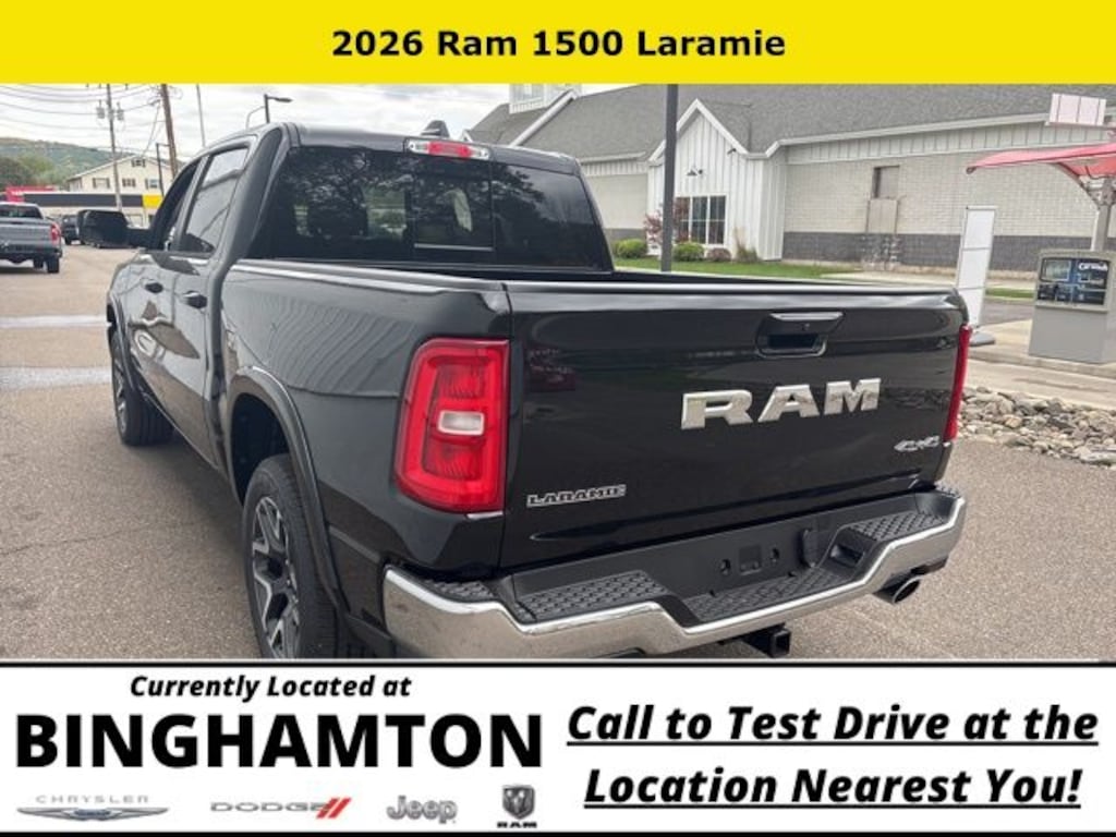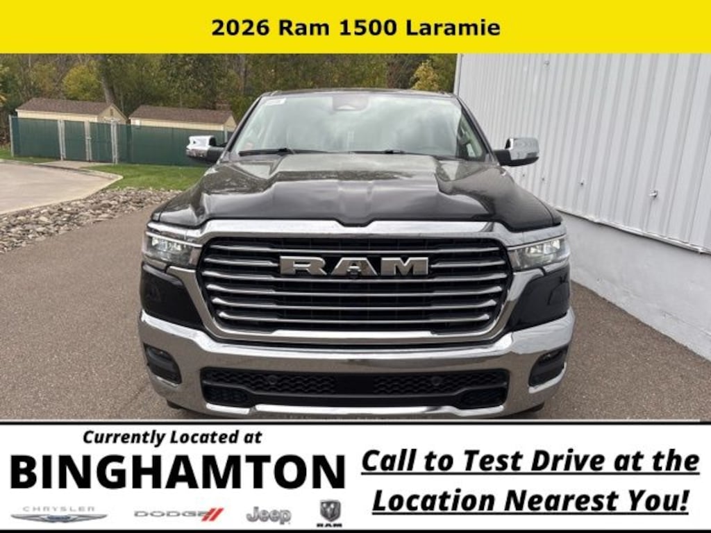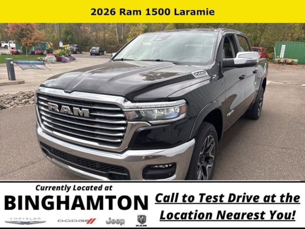 Diamond Black Crystal Pearlcoat 2026 Ram 1500 Laramie 4WD 8-Speed Automatic 3.0L I6 Save Time at the Dealership by Customizing your Deal Online!, 10 Speakers, 3.55 Rear Axle Ratio, 4-Wheel Disc Brakes, 4G LTE Wi-Fi Hot Spot, ABS brakes, Active Noise Control System, Air Conditioning, Alloy wheels, AM/FM radio: SiriusXM with 360L, Apple CarPlay/Android Auto, Audio memory, Auto High-beam Headlights, Auto Power-Folding Mirrors, Auto-dimming door mirrors, Auto-Dimming Exterior Driver Mirror, Auto-dimming Rear-View mirror, Automatic temperature control, Brake assist, Bumpers: chrome, Chrome Exterior Mirrors, Compass, Connected Travel and Traffic Services, Connectivity - US/Canada, Convex Wide-Angle Exterior Mirror Insert, Delay-off headlights, Driver door bin, Driver vanity mirror, Dual front impact airbags, Dual front side impact airbags, Electronic Stability Control, Exterior Mirrors Courtesy Lamps, Exterior Mirrors with Heating Element, Exterior Mirrors with Memory, Exterior Mirrors with Supplemental Signals, Front anti-roll bar, Front Bucket Seats, Front Center Armrest w/Storage, Front dual zone A/C, Front fog lights, Front License Plate Bracket, Front reading lights, Front wheel independent suspension, Fully automatic headlights, Garage door transmitter, GPS Navigation, Heated door mirrors, Heated front seats, Heated rear seats, Heated steering wheel, Illuminated entry, Integrated Center Stack Radio, Integrated Voice Command with Bluetooth, Laramie Level 1 Equipment Group, Leather steering wheel, Leather Trimmed Bucket Seats, Low tire pressure warning, Manufacturer's Statement of Origin, Memory seat, MOPAR Front and Rear Rubber Floor Mats, Navigation System, Occupant sensing airbag, Off-Road Information Pages, Outside temperature display, Overhead airbag, Overhead console, Panic alarm, ParkView Rear Back-Up Camera, Passenger door bin, Passenger vanity mirror, Power door mirrors, Power driver seat, Power passenger seat, Power steering, Power windows, Quick Order Package 21H Laramie, Radio data system, Radio: Uconnect 5 Navigation with 12.0" Display, Rain Sensitive Windshield Wipers, RAM Grille Badge - Chrome, Rear anti-roll bar, Rear reading lights, Rear seat center armrest, Rear step bumper, Remote keyless entry, Remote Tailgate Release, Security system, SiriusXM Radio Service, SiriusXM with 360L, Speed control, Split folding rear seat, Steering wheel mounted audio controls, Tachometer, Telescoping steering wheel, Tilt steering wheel, Traction control, Trip computer, Turn signal indicator mirrors, USB Host Flip, Variably intermittent wipers, Ventilated front seats, Voltmeter, Wheels: 20" x 9" Premium Paint/Polish.