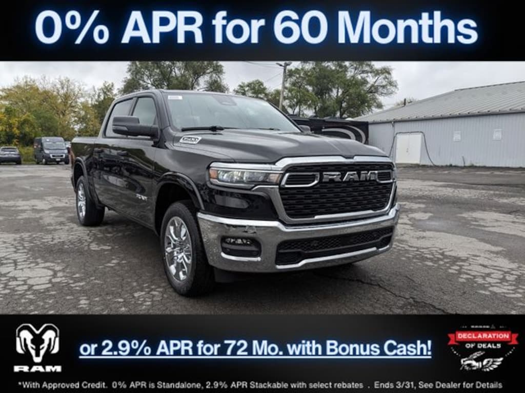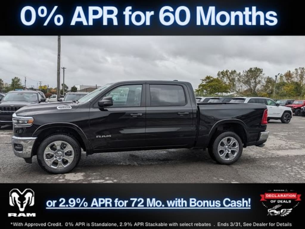 Diamond Black Crystal Pearlcoat 2026 Ram 1500 Big Horn/Lone Star 4WD 8-Speed Automatic 3.0L I6 Save Time at the Dealership by Customizing your Deal Online!, 115V Auxiliary Power Outlet, 2nd Row in Floor Storage Bins, 3 Rear Seat Head Restraints, 4 Way Front Headrests, 4-Wheel Disc Brakes, 400W Inverter, 48V Belt Starter Generator, 4G LTE Wi-Fi Hot Spot, 6 Speakers, ABS brakes, Air Conditioning, Alloy wheels, AM/FM radio, Apple CarPlay, Apple CarPlay/Android Auto, Auto High-beam Headlights, Auto Power-Folding Mirrors, Auto-Dimming Exterior Driver Mirror, Auto-Dimming Rear-View Mirror, Bed Utility Group, Big Horn Level 1 Equipment Group, Black Exterior Mirrors, Black Premium Power Mirrors, Body Color Fender Flares, Brake assist, Bucket Seats, Bumpers: chrome, Center Console Parts Module, Cloth Bucket Seats, Compass, Connectivity - US/Canada, Convex Wide-Angle Exterior Mirror Insert, Delay-off headlights, Deluxe Cloth Bucket Seats, Driver door bin, Dual front impact airbags, Dual front side impact airbags, Electronic Stability Control, Exterior 115V AC Outlet, Exterior Mirrors Courtesy Lamps, Exterior Mirrors with Heating Element, Exterior Mirrors with Supplemental Signals, Front anti-roll bar, Front Bucket Seats, Front Center Armrest w/Storage, Front fog lights, Front License Plate Bracket, Front reading lights, Front Seat Back Map Pockets, Front wheel independent suspension, Full Length Floor Console, Fully automatic headlights, Global Telematics Box Module, Glove Box Lamp, Google Android Auto, GPS Antenna Input, Heated door mirrors, Heated Front Seats, Heated Steering Wheel, Illuminated entry, Integrated Center Stack Radio, Integrated Voice Command with Bluetooth, Leather Wrapped Steering Wheel, Low tire pressure warning, Manual Adjust 4-Way Driver Seat, Manual Adjust 4-Way Front Passenger Seat, Manual Folding Exterior Mirrors, Manufacturer's Statement of Origin, MOPAR 4 Adjustable Cargo Tie-Down Hooks, MOPAR Front and Rear Rubber Floor Mats, MOPAR Spray in Bedliner, Occupant sensing airbag, Outside temperature display, Overhead airbag, Overhead console, Panic alarm, ParkView Rear Back-Up Camera, Passenger door bin, Passenger vanity mirror, Pick-Up Box Lighting, Power 2-Way Driver Lumbar Adjust, Power Adjust 8-Way Driver Seat, Power Adjustable Pedals, Power door mirrors, Power steering, Power windows, Quick Order Package 21Z Big Horn, Radio data system, Radio: Uconnect 5 W with 8.4" Display, RAM Grille Badge - Chrome, Rear 60/40 Folding Seat, Rear anti-roll bar, Rear Center Armrest, Rear Dome with on/Off Switch Lamp, Rear Power Sliding Window, Rear step bumper, Rear Wheelhouse Liners, Rear Window Defroster, Remote keyless entry, SiriusXM Radio Service, SiriusXM Satellite Radio, Speed control, Steering Wheel Mounted Audio Controls, Sun Visors with Illuminated Vanity Mirrors, Supplier Part Tracking (J-1), Tachometer, Telescoping steering wheel, Tilt steering wheel, Traction control, Trailer Brake Control, Trip computer, Universal Garage Door Opener, USB Host Flip, Variably intermittent wipers, Voltmeter, Wheels: 20" x 9" Aluminum Chrome Clad.