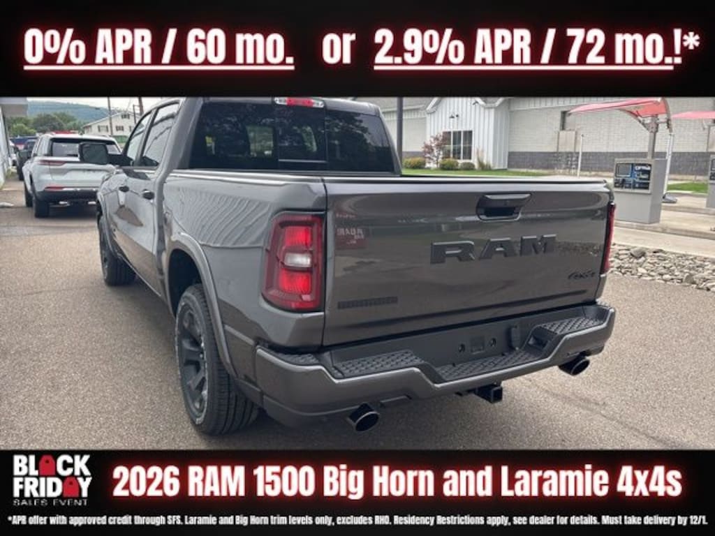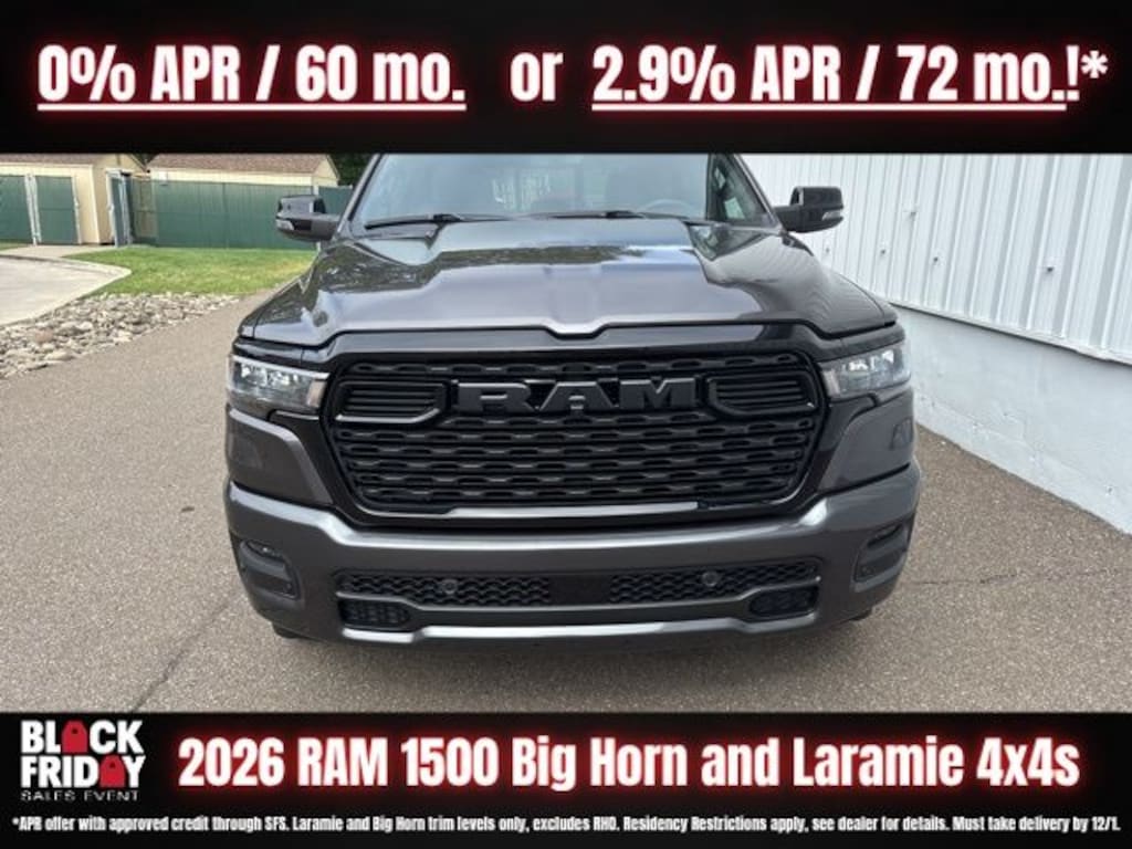Granite Crystal Metallic Clearcoat 2026 Ram 1500 Big Horn/Lone Star 4WD 8-Speed Automatic 3.0L I6 Save Time at the Dealership by Customizing your Deal Online!, 115V Auxiliary Power Outlet, 115V Auxiliary Rear Power Outlet, 12" Touchscreen Display, 2nd Row In Floor Storage Bins, 3 Rear Seat Head Restraints, 4 Way Front Headrests, 4-Wheel Disc Brakes, 400W Inverter, 48V Belt Starter Generator, 4G LTE Wi-Fi Hot Spot, 6 Speakers, 9 Amplified Speakers w/Subwoofer, ABS brakes, Accent Color Door Handles, Accent Color Premium Power Mirrors, Accent Color Tailgate Handle, Air Conditioning, Air Conditioning ATC w/Dual Zone Control, Alloy wheels, AM/FM radio, Anti-Spin Differential Rear Axle, Apple CarPlay, Apple CarPlay/Android Auto, Auto High-beam Headlights, Auto Power-Folding Mirrors, Auto-Dimming Exterior Driver Mirror, Auto-Dimming Rear-View Mirror, Big Horn Level 2 Equipment Group, Black Exterior Mirrors, Black Exterior Truck Badging, Black Headlamp Bezels, Black Interior Accents, Black Painted Exterior Mirrors Caps, Black Premium Power Mirrors, Black Tail Lamp Bezels, Body Color Fender Flares, Body Color Front Bumper, Body Color Rear Bumper w/Step Pads, Brake assist, Bucket Seats, Bumpers: chrome, Center Console Parts Module, Cloth Bucket Seats, Cluster 12" TFT Color Display, Cluster 7.0" TFT Color Display, Compass, Configurable Drive Mode, Connected Travel & Traffic Services, Connectivity - US/Canada, Convex Wide-Angle Exterior Mirror Insert, Delay-off headlights, Deluxe Cloth Bucket Seats, Disassociated Touchscreen Display, Driver door bin, Dual Exhaust w/Black Tips, Dual front impact airbags, Dual front side impact airbags, Electronic Stability Control, Exterior Mirrors Courtesy Lamps, Exterior Mirrors w/Heating Element, Exterior Mirrors w/Supplemental Signals, Front anti-roll bar, Front Bucket Seats, Front Center Armrest w/Storage, Front fog lights, Front License Plate Bracket, Front reading lights, Front Seat Back Map Pockets, Front wheel independent suspension, Full Length Floor Console, Fully automatic headlights, Global Telematics Box Module (TBM), Glove Box Lamp, Google Android Auto, GPS Antenna Input, GPS Navigation, Grille Black Surround Black Mesh, HD Radio, Heated door mirrors, Heated Front Seats, Heated Steering Wheel, Illuminated entry, Integrated Center Stack Radio, Integrated Voice Command w/Bluetooth, Leather Wrapped Steering Wheel, LED Dome Lamp w/On/Off Switch, LED Footwell Lighting, Low tire pressure warning, Manual Adjust 4-Way Driver Seat, Manual Adjust 4-Way Front Passenger Seat, Manual Folding Exterior Mirrors, Media Hub w/2 Charge Only USBs, MOPAR Front & Rear Rubber Floor Mats, Night Edition, Occupant sensing airbag, Outside temperature display, Overhead airbag, Overhead console, Overhead LED Lamps, Panic alarm, ParkView Rear Back-Up Camera, Passenger door bin, Passenger vanity mirror, Power 2-Way Driver Lumbar Adjust, Power Adjust 8-Way Driver Seat, Power Adjustable Pedals, Power door mirrors, Power steering, Power windows, Premium Overhead Console, Quick Order Package 21Z Big Horn, Radio data system, Radio: Uconnect 5 Nav w/12.0" Display, Radio: Uconnect 5 W w/8.4" Display, RAM Grille Badge - Black, RAM Grille Badge - Chrome, Rear 60/40 Folding Seat, Rear anti-roll bar, Rear Center Armrest, Rear Power Sliding Window, Rear step bumper, Rear Wheelhouse Liners, Rear Window Defroster, Remote keyless entry, Remote Tailgate Release, Security Alarm, SiriusXM Radio Service, SiriusXM w/360L, Speed control, Steering Wheel Mounted Audio Controls, Sun Visors w/Illuminated Vanity Mirrors, Supplier Part Tracking (J-1), Tachometer, Telescoping steering wheel, Tilt steering wheel, Traction control, Trailer Brake Control, Trip computer, Universal Garage Door Opener, USB Host Flip, Variably intermittent wipers, Voltmeter, Wheels: 18" x 8" Cast-Aluminum Painted, Wheels: 20" x 9.0" Aluminum Painted Clad, Wheels: 20" x 9" Aluminum Chrome Clad (WRK).