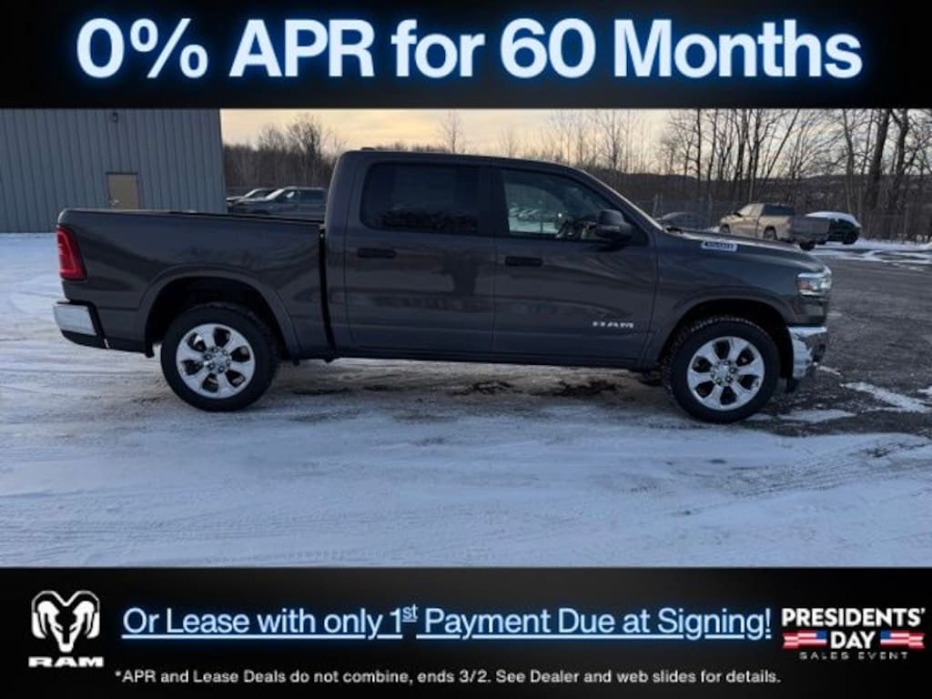 Granite Crystal Metallic Clearcoat 2026 Ram 1500 Big Horn/Lone Star 4WD 8-Speed Automatic 3.0L I6 Save Time at the Dealership by Customizing your Deal Online!, 115V Auxiliary Power Outlet, 2nd Row in Floor Storage Bins, 3 Rear Seat Head Restraints, 4 Way Front Headrests, 4-Wheel Disc Brakes, 400W Inverter, 48V Belt Starter Generator, 4G LTE Wi-Fi Hot Spot, 6 Speakers, ABS brakes, Air Conditioning, Alloy wheels, AM/FM radio, Apple CarPlay, Apple CarPlay/Android Auto, Auto High-beam Headlights, Auto Power-Folding Mirrors, Auto-Dimming Exterior Driver Mirror, Auto-Dimming Rear-View Mirror, Big Horn Level 1 Equipment Group, Black Exterior Mirrors, Black Premium Power Mirrors, Body Color Fender Flares, Brake assist, Bucket Seats, Bumpers: chrome, Center Console Parts Module, Cloth Bucket Seats, Compass, Connectivity - US/Canada, Convex Wide-Angle Exterior Mirror Insert, Delay-off headlights, Deluxe Cloth Bucket Seats, Driver door bin, Dual front impact airbags, Dual front side impact airbags, Electronic Stability Control, Exterior Mirrors Courtesy Lamps, Exterior Mirrors with Heating Element, Exterior Mirrors with Supplemental Signals, Front anti-roll bar, Front Bucket Seats, Front Center Armrest w/Storage, Front fog lights, Front License Plate Bracket, Front reading lights, Front Seat Back Map Pockets, Front wheel independent suspension, Full Length Floor Console, Fully automatic headlights, Global Telematics Box Module, Glove Box Lamp, Google Android Auto, GPS Antenna Input, Heated door mirrors, Heated Front Seats, Heated Steering Wheel, Illuminated entry, Integrated Center Stack Radio, Integrated Voice Command with Bluetooth, Leather Wrapped Steering Wheel, Low tire pressure warning, Manual Adjust 4-Way Driver Seat, Manual Adjust 4-Way Front Passenger Seat, Manual Folding Exterior Mirrors, Manufacturer's Statement of Origin, MOPAR Front and Rear Rubber Floor Mats, Occupant sensing airbag, Outside temperature display, Overhead airbag, Overhead console, Panic alarm, ParkView Rear Back-Up Camera, Passenger door bin, Passenger vanity mirror, Power 2-Way Driver Lumbar Adjust, Power Adjust 8-Way Driver Seat, Power Adjustable Pedals, Power door mirrors, Power steering, Power windows, Quick Order Package 21Z Big Horn, Radio data system, Radio: Uconnect 5 W with 8.4" Display, RAM Grille Badge - Chrome, Rear 60/40 Folding Seat, Rear anti-roll bar, Rear Center Armrest, Rear Dome with on/Off Switch Lamp, Rear Power Sliding Window, Rear step bumper, Rear Wheelhouse Liners, Rear Window Defroster, Remote keyless entry, SiriusXM Radio Service, SiriusXM Satellite Radio, Speed control, Steering Wheel Mounted Audio Controls, Sun Visors with Illuminated Vanity Mirrors, Supplier Part Tracking (J-1), Tachometer, Telescoping steering wheel, Tilt steering wheel, Traction control, Trip computer, Universal Garage Door Opener, USB Host Flip, Variably intermittent wipers, Voltmeter, Wheels: 20" x 9" Aluminum Chrome Clad.