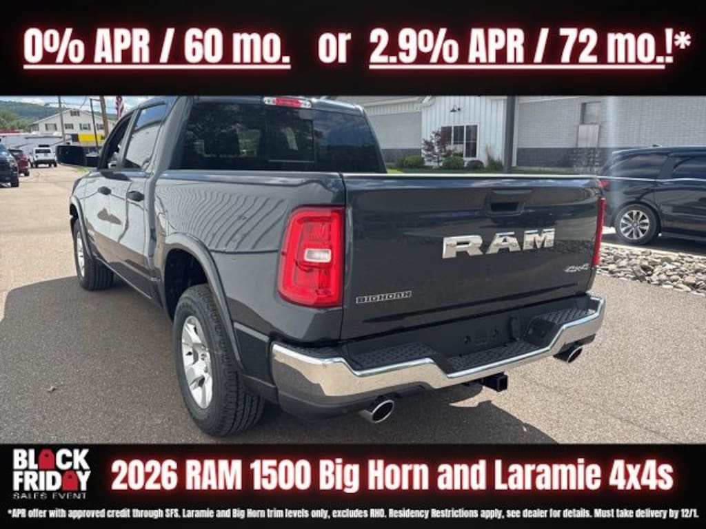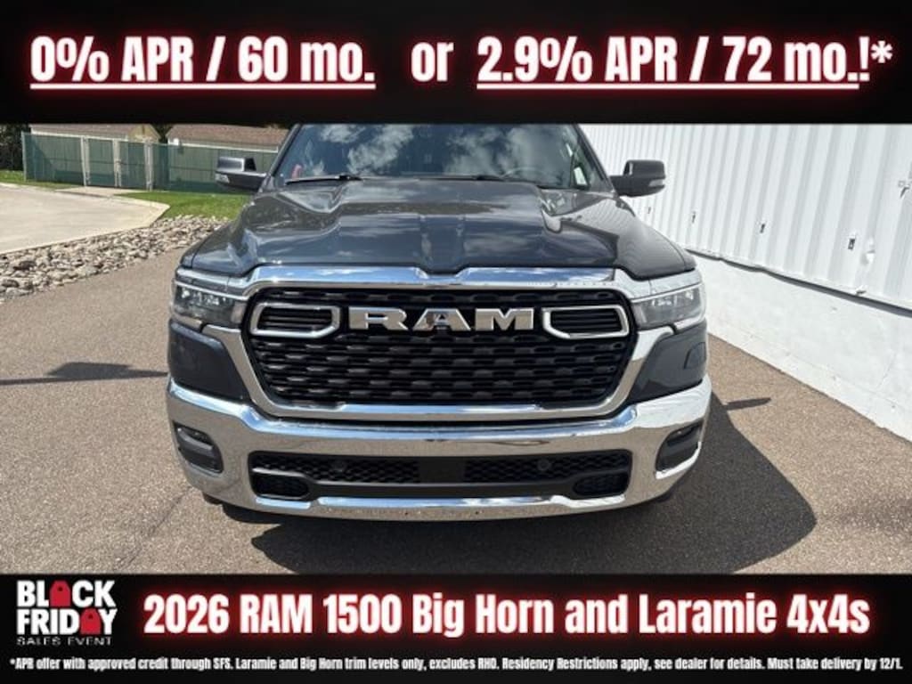 Forged Blue Metallic 2026 Ram 1500 Big Horn/Lone Star 4WD 8-Speed Automatic 3.0L I6 Save Time at the Dealership by Customizing your Deal Online!, 115V Auxiliary Power Outlet, 2nd Row In Floor Storage Bins, 3 Rear Seat Head Restraints, 4 Way Front Headrests, 4-Wheel Disc Brakes, 400W Inverter, 48V Belt Starter Generator, 4G LTE Wi-Fi Hot Spot, 6 Speakers, ABS brakes, Air Conditioning, Alloy wheels, AM/FM radio, Apple CarPlay, Apple CarPlay/Android Auto, Auto High-beam Headlights, Auto Power-Folding Mirrors, Auto-Dimming Exterior Driver Mirror, Auto-Dimming Rear-View Mirror, Big Horn Level 1 Equipment Group, Black Exterior Mirrors, Black Premium Power Mirrors, Body Color Fender Flares, Brake assist, Bucket Seats, Bumpers: chrome, Center Console Parts Module, Cloth Bucket Seats, Compass, Connectivity - US/Canada, Convex Wide-Angle Exterior Mirror Insert, Delay-off headlights, Deluxe Cloth Bucket Seats, Driver door bin, Dual front impact airbags, Dual front side impact airbags, Electronic Stability Control, Exterior Mirrors Courtesy Lamps, Exterior Mirrors w/Heating Element, Exterior Mirrors w/Supplemental Signals, Front anti-roll bar, Front Bucket Seats, Front Center Armrest w/Storage, Front fog lights, Front License Plate Bracket, Front reading lights, Front Seat Back Map Pockets, Front wheel independent suspension, Full Length Floor Console, Fully automatic headlights, Global Telematics Box Module (TBM), Glove Box Lamp, Google Android Auto, GPS Antenna Input, Heated door mirrors, Heated Front Seats, Heated Steering Wheel, Illuminated entry, Integrated Center Stack Radio, Integrated Voice Command w/Bluetooth, Leather Wrapped Steering Wheel, Low tire pressure warning, Manual Adjust 4-Way Driver Seat, Manual Adjust 4-Way Front Passenger Seat, Manual Folding Exterior Mirrors, MOPAR Front & Rear Rubber Floor Mats, Occupant sensing airbag, Outside temperature display, Overhead airbag, Overhead console, Panic alarm, ParkView Rear Back-Up Camera, Passenger door bin, Passenger vanity mirror, Power 2-Way Driver Lumbar Adjust, Power Adjust 8-Way Driver Seat, Power Adjustable Pedals, Power door mirrors, Power steering, Power windows, Quick Order Package 21Z Big Horn, Radio data system, Radio: Uconnect 5 W w/8.4" Display, RAM Grille Badge - Chrome, Rear 60/40 Folding Seat, Rear anti-roll bar, Rear Center Armrest, Rear Dome w/On/Off Switch Lamp, Rear Power Sliding Window, Rear step bumper, Rear Wheelhouse Liners, Rear Window Defroster, Remote keyless entry, SiriusXM Radio Service, SiriusXM Satellite Radio, Speed control, Steering Wheel Mounted Audio Controls, Sun Visors w/Illuminated Vanity Mirrors, Supplier Part Tracking (J-1), Tachometer, Telescoping steering wheel, Tilt steering wheel, Traction control, Trip computer, Universal Garage Door Opener, USB Host Flip, Variably intermittent wipers, Voltmeter, Wheels: 18" x 8" Cast-Aluminum Painted.