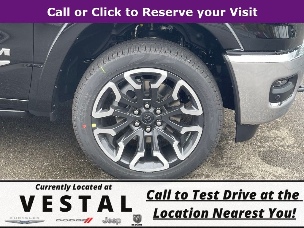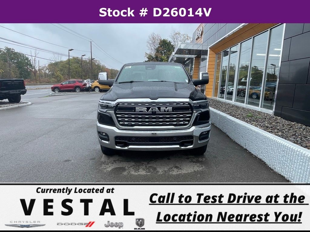 Diamond Black Crystal Pearlcoat 2026 Ram 1500 Limited 4WD 8-Speed Automatic 3.0L I6 12-Way/1-Way Trailer Connector, 14.4" Touchscreen Display, 19 Speakers, 240 Amp Alternator, 3.92 Rear Axle Ratio, 4-Wheel Disc Brakes, 4G LTE Wi-Fi Hot Spot, ABS brakes, Active Noise Control System, Adjustable pedals, Air Conditioning, Alloy wheels, AM/FM radio, Apple CarPlay, Apple CarPlay/Android Auto, Audio memory, Auto High-beam Headlights, Auto Power-Folding Mirrors, Auto-dimming door mirrors, Auto-Dimming Exterior Driver Mirror, Auto-Dimming Exterior Passenger Mirror, Auto-dimming Rear-View mirror, Auto-leveling suspension, Automatic temperature control, Bed Utility Group, Bluetooth, Bodyside moldings, Brake assist, Bumpers: chrome, Chrome Exterior Mirrors, Chrome Power-Fold Trailer Tow Mirrors, Compass, Connected Travel & Traffic Services, Connectivity - US/Canada, Convex Wide-Angle Exterior Mirror Insert, Delay-off headlights, Disassociated Touchscreen Display, Dome Dual LED Reading Lamp, Driver door bin, Driver vanity mirror, Drowsy Driver Detection, Dual front impact airbags, Dual front side impact airbags, Dual-Pane Panoramic Sunroof, Electronic Stability Control, Evasive Steer Assist, Exterior 115V AC Outlet, Exterior Mirrors Courtesy Lamps, Exterior Mirrors w/Heating Element, Exterior Mirrors w/Memory, Exterior Mirrors w/Supplemental Signals, Exterior Parking Camera Rear, Forward & Reverse Utility Lights, Front anti-roll bar, Front Bucket Seats, Front Center Armrest w/Storage, Front dual zone A/C, Front fog lights, Front License Plate Bracket, Front reading lights, Front wheel independent suspension, Fully automatic headlights, Garage door transmitter, Genuine wood console insert, Genuine wood dashboard insert, Genuine wood door panel insert, Global Telematics Box Module (TBM), Google Android Auto, GPS Antenna Input, GPS Navigation, Hands-Free Active Driving Assist System, HD Radio, Heads-Up Display, Heated door mirrors, Heated front seats, Heated rear seats, Heated steering wheel, Illuminated entry, Integrated Center Stack Radio, Integrated Voice Command w/Bluetooth, Intersection Collision Assist System, Leather steering wheel, LED CHMSL Lamp, LED Dome/Reading Lamp, Limited Level A Equipment Group, Low tire pressure warning, Manufacturer's Statement of Origin, Memory seat, Mirror Clearance/Running Lights, MOPAR 4 Adjustable Cargo Tie-Down Hooks, Multi-Function Tailgate, Navigation System, Occupant sensing airbag, Outside temperature display, Overhead airbag, Overhead console, Panic alarm, Passenger door bin, Passenger vanity mirror, Pedal memory, Pirelli Brand Tires, Power door mirrors, Power driver seat, Power passenger seat, Power steering, Power Telescoping Mirrors, Power windows, Power-Adjustable Convex Aux Mirrors, Premium Quilted Leather Bucket Seats, Quick Order Package 22M Limited, Radio data system, Radio: Uconnect 5 Nav w/12.0" Display, Radio: Uconnect 5 Nav w/14.4" Display, Rain sensing wipers, RAM's Head Badge, RamBox Cargo Management System, Rear anti-roll bar, Rear reading lights, Rear seat center armrest, Rear step bumper, Rear window defroster, Remote keyless entry, Remote Tailgate Release, Security system, SiriusXM Radio Service, SiriusXM w/360L, Smartphone As A Key Capable, Speed control, Split folding rear seat, Steering wheel mounted audio controls, Surround View Camera System, Tachometer, Telescoping steering wheel, Tilt steering wheel, Traction control, Traffic Sign Recognition, Trailer Brake Control, Trailer Light Check, Trailer Reverse Steering Control, Trailer Tire Pressure Monitoring System, Trailer Tow Group, Trailer Tow Mirrors, Tri-Fold Tonneau Cover, Trip computer, Turn signal indicator mirrors, USB Host Flip, Variably intermittent wipers, Ventilated front seats, Ventilated rear seats, Wheels: 20" x 9" Premium Paint/Polished, Wheels: 22" x 9" Premium Paint/Polished.
