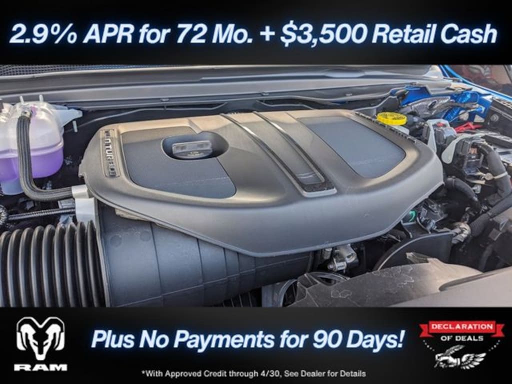 Hydro Blue Pearlcoat 2026 Ram 1500 Laramie 4WD 8-Speed Automatic 3.0L I6 Save Time at the Dealership by Customizing your Deal Online!, 10 Speakers, 14.4" Touchscreen Display, 33 Gallon Fuel Tank, 4-Wheel Disc Brakes, 4G LTE Wi-Fi Hot Spot, ABS brakes, Accent Color Door Handles, Accent Color Premium Power Mirrors, Accent Color Tailgate Handle, Active Noise Control System, Adjustable pedals, Air Conditioning, Alloy wheels, AM/FM radio: SiriusXM with 360L, Anti-Spin Differential Rear Axle, Apple CarPlay/Android Auto, Audio memory, Auto High-beam Headlights, Auto Power-Folding Mirrors, Auto-dimming door mirrors, Auto-Dimming Exterior Driver Mirror, Auto-dimming Rear-View mirror, Automatic temperature control, Black Exterior Truck Badging, Black Headlamp Bezels, Black Interior Accents, Black Painted Exterior Mirrors Caps, Black Tail Lamp Bezels, Body Color Front Bumper, Body Color Rear Bumper with Step Pads, Brake assist, Bumpers: chrome, Chrome Exterior Mirrors, Cluster 12" TFT Color Display, Compass, Connected Travel and Traffic Services, Connectivity - US/Canada, Convex Wide-Angle Exterior Mirror Insert, Delay-off headlights, Dome Dual LED Reading Lamp, Driver door bin, Driver vanity mirror, Dual Exhaust with Black Tips, Dual front impact airbags, Dual front side impact airbags, Dual-Pane Panoramic Sunroof, Electronic Stability Control, Exterior Mirrors Approach Lamps, Exterior Mirrors Courtesy Lamps, Exterior Mirrors with Heating Element, Exterior Mirrors with Memory, Exterior Mirrors with Supplemental Signals, Front anti-roll bar, Front Bucket Seats, Front Center Armrest w/Storage, Front dual zone A/C, Front fog lights, Front Passenger Interactive Display, Front reading lights, Front wheel independent suspension, Fully automatic headlights, Garage door transmitter, GPS Navigation, Grille Surround 3 Black Texture 2 Black, Harman/Kardon 19 Speaker Premium Sound, Heated door mirrors, Heated front seats, Heated rear seats, Heated steering wheel, Illuminated entry, Integrated Center Stack Radio, Integrated Voice Command with Bluetooth, Laramie Level 2 Equipment Group, Leather steering wheel, Leather Trimmed Bucket Seats, LED Dome/Reading Lamp, Low tire pressure warning, Manufacturer's Statement of Origin, Memory seat, MOPAR Front and Rear Rubber Floor Mats, Navigation System, Night Edition, Occupant sensing airbag, Off-Road Information Pages, Outside temperature display, Overhead airbag, Overhead console, Panic alarm, ParkView Rear Back-Up Camera, Passenger door bin, Passenger vanity mirror, Pedal memory, Pirelli Brand Tires, Power Deployable Running Boards, Power door mirrors, Power driver seat, Power passenger seat, Power steering, Power Tailgate, Power windows, Proximity Approach/Departure Lamps, Quick Order Package 21H Laramie, Radio data system, Radio: Uconnect 5 Nav with 14.4" Display, Radio: Uconnect 5 Navigation with 12.0" Display, Rain Sensitive Windshield Wipers, RAM Grille Badge - Black, RAM Grille Badge - Chrome, Rear anti-roll bar, Rear reading lights, Rear seat center armrest, Rear step bumper, Remote keyless entry, Security system, SiriusXM Radio Service, SiriusXM with 360L, Speed control, Split folding rear seat, Sport Performance Hood, Steering wheel mounted audio controls, Tachometer, Telescoping steering wheel, Tilt steering wheel, Traction control, Trailer Brake Control, Trip computer, Turn signal indicator mirrors, USB Host Flip, Variably intermittent wipers, Ventilated front seats, Voltmeter, Wheels: 20" x 9" Premium Paint/Polish, Wheels: 22" x 9" Forged Aluminum.