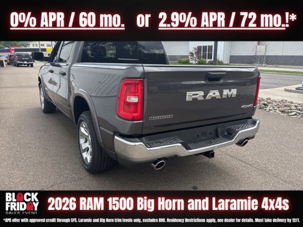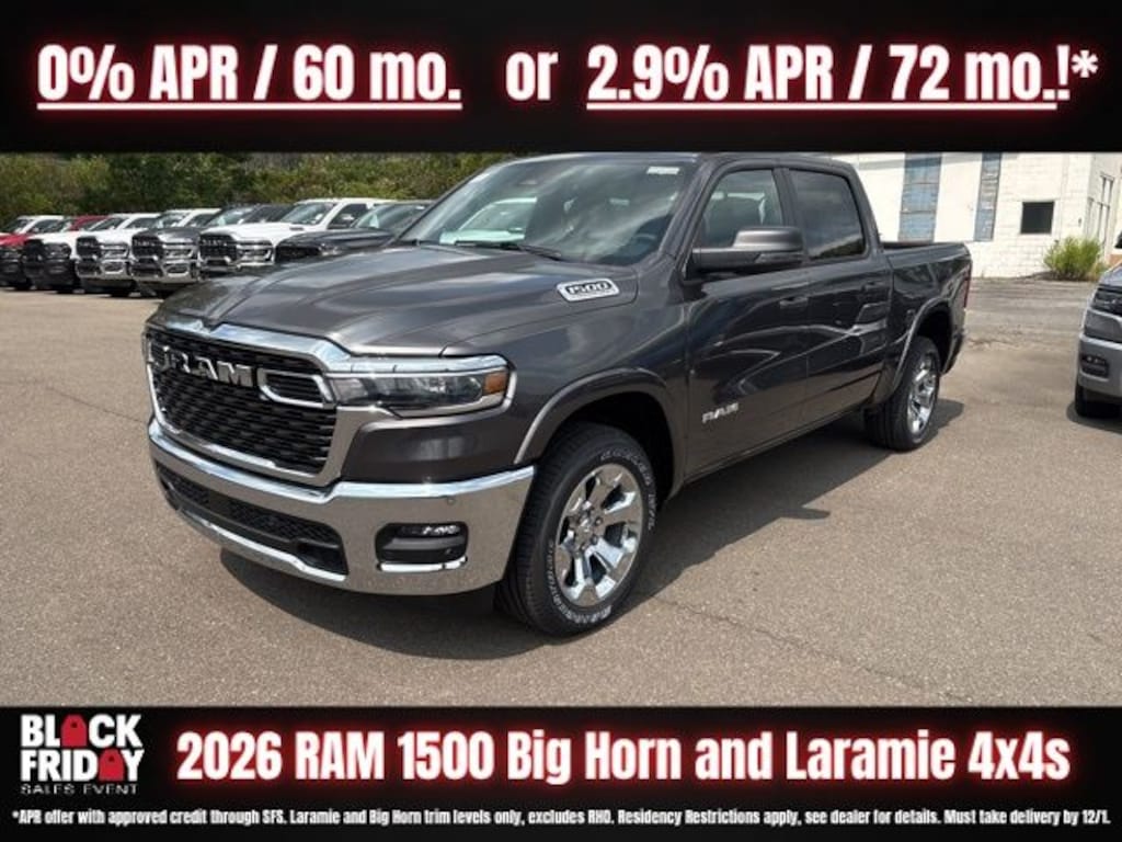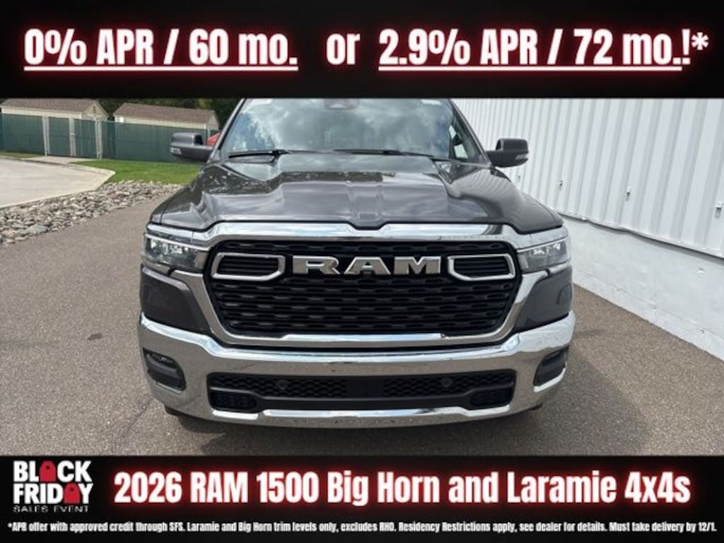 Granite Crystal Metallic Clearcoat 2026 Ram 1500 Big Horn/Lone Star 4WD 8-Speed Automatic 3.0L I6 Save Time at the Dealership by Customizing your Deal Online!, 115V Auxiliary Power Outlet, 115V Auxiliary Rear Power Outlet, 12" Touchscreen Display, 2nd Row In Floor Storage Bins, 3 Rear Seat Head Restraints, 4 Way Front Headrests, 4-Wheel Disc Brakes, 400W Inverter, 48V Belt Starter Generator, 4G LTE Wi-Fi Hot Spot, 6 Speakers, 9 Amplified Speakers w/Subwoofer, ABS brakes, Air Conditioning, Air Conditioning ATC w/Dual Zone Control, Alloy wheels, AM/FM radio, Apple CarPlay, Apple CarPlay/Android Auto, Auto High-beam Headlights, Auto Power-Folding Mirrors, Auto-Dimming Exterior Driver Mirror, Auto-Dimming Rear-View Mirror, Big Horn Level 2 Equipment Group, Black Exterior Mirrors, Black Premium Power Mirrors, Body Color Fender Flares, Brake assist, Bucket Seats, Bumpers: chrome, Center Console Parts Module, Cloth Bucket Seats, Cluster 12" TFT Color Display, Cluster 7.0" TFT Color Display, Compass, Configurable Drive Mode, Connected Travel & Traffic Services, Connectivity - US/Canada, Convex Wide-Angle Exterior Mirror Insert, Delay-off headlights, Deluxe Cloth Bucket Seats, Disassociated Touchscreen Display, Driver door bin, Dual front impact airbags, Dual front side impact airbags, Electronic Stability Control, Exterior Mirrors Courtesy Lamps, Exterior Mirrors w/Heating Element, Exterior Mirrors w/Supplemental Signals, Front anti-roll bar, Front Bucket Seats, Front Center Armrest w/Storage, Front fog lights, Front License Plate Bracket, Front reading lights, Front Seat Back Map Pockets, Front wheel independent suspension, Full Length Floor Console, Fully automatic headlights, Global Telematics Box Module (TBM), Glove Box Lamp, Google Android Auto, GPS Antenna Input, GPS Navigation, HD Radio, Heated door mirrors, Heated Front Seats, Heated Steering Wheel, Illuminated entry, Integrated Center Stack Radio, Integrated Voice Command w/Bluetooth, Leather Wrapped Steering Wheel, LED Dome Lamp w/On/Off Switch, LED Footwell Lighting, Low tire pressure warning, Manual Adjust 4-Way Driver Seat, Manual Adjust 4-Way Front Passenger Seat, Manual Folding Exterior Mirrors, Media Hub w/2 Charge Only USBs, MOPAR Front & Rear Rubber Floor Mats, Occupant sensing airbag, Outside temperature display, Overhead airbag, Overhead console, Overhead LED Lamps, Panic alarm, ParkView Rear Back-Up Camera, Passenger door bin, Passenger vanity mirror, Power 2-Way Driver Lumbar Adjust, Power Adjust 8-Way Driver Seat, Power Adjustable Pedals, Power door mirrors, Power steering, Power windows, Premium Overhead Console, Quick Order Package 21Z Big Horn, Radio data system, Radio: Uconnect 5 Nav w/12.0" Display, Radio: Uconnect 5 W w/8.4" Display, RAM Grille Badge - Chrome, Rear 60/40 Folding Seat, Rear anti-roll bar, Rear Center Armrest, Rear Power Sliding Window, Rear step bumper, Rear Wheelhouse Liners, Rear Window Defroster, Remote keyless entry, Remote Tailgate Release, Security Alarm, SiriusXM Radio Service, SiriusXM w/360L, Speed control, Steering Wheel Mounted Audio Controls, Sun Visors w/Illuminated Vanity Mirrors, Supplier Part Tracking (J-1), Tachometer, Telescoping steering wheel, Tilt steering wheel, Traction control, Trip computer, Universal Garage Door Opener, USB Host Flip, Variably intermittent wipers, Voltmeter, Wheels: 18" x 8" Cast-Aluminum Painted, Wheels: 20" x 9" Aluminum Chrome Clad (WRK).