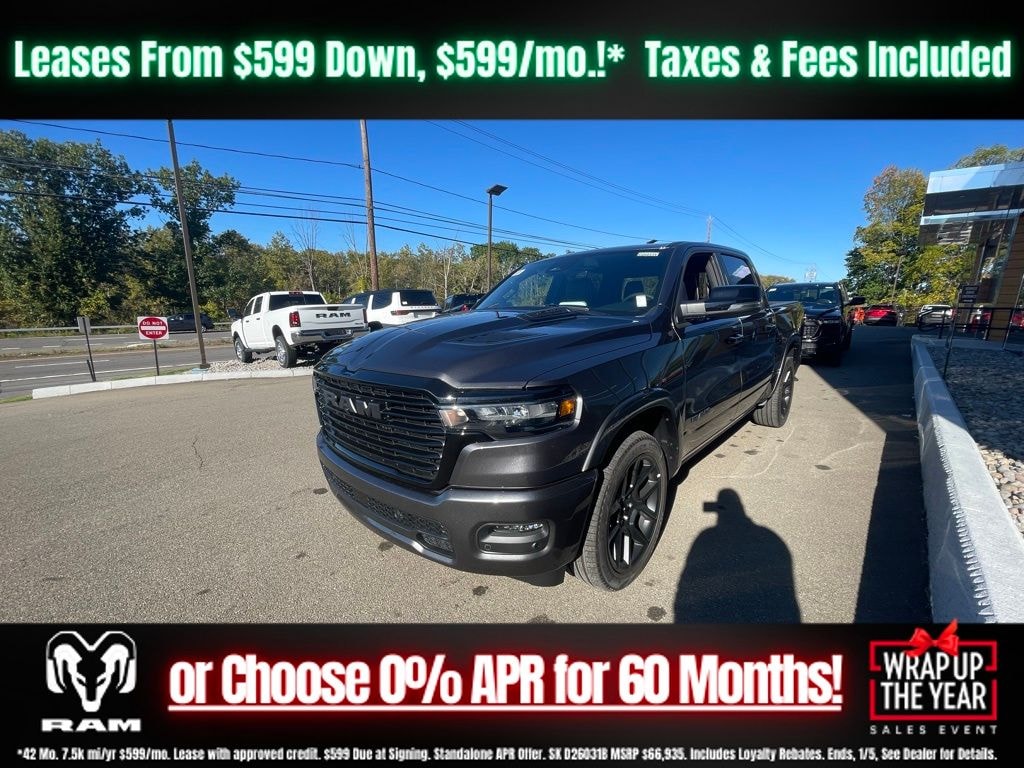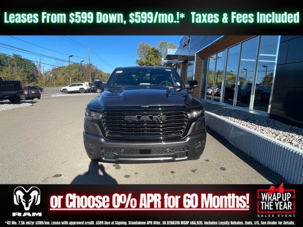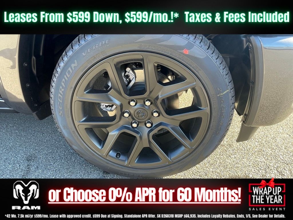 Granite Crystal Metallic Clearcoat 2026 Ram 1500 Laramie 4WD 8-Speed Automatic 3.0L I6 10 Speakers, 14.4" Touchscreen Display, 3.55 Rear Axle Ratio, 33 Gallon Fuel Tank, 4-Wheel Disc Brakes, 4G LTE Wi-Fi Hot Spot, ABS brakes, Accent Color Door Handles, Accent Color Premium Power Mirrors, Accent Color Tailgate Handle, Active Noise Control System, Air Conditioning, Alloy wheels, AM/FM radio: SiriusXM with 360L, Anti-Spin Differential Rear Axle, Apple CarPlay/Android Auto, Audio memory, Auto High-beam Headlights, Auto Power-Folding Mirrors, Auto-dimming door mirrors, Auto-Dimming Exterior Driver Mirror, Auto-dimming Rear-View mirror, Automatic temperature control, Bed Utility Group, Black Exterior Truck Badging, Black Headlamp Bezels, Black Interior Accents, Black Painted Exterior Mirrors Caps, Black Tail Lamp Bezels, Bluetooth, Body Color Front Bumper, Body Color Rear Bumper with Step Pads, Brake assist, Bumpers: chrome, Chrome Exterior Mirrors, Cluster 12" TFT Color Display, Compass, Connected Travel and Traffic Services, Connectivity - US/Canada, Convex Wide-Angle Exterior Mirror Insert, Delay-off headlights, Driver door bin, Driver vanity mirror, Dual Exhaust with Black Tips, Dual front impact airbags, Dual front side impact airbags, Electronic Stability Control, Exterior 115V AC Outlet, Exterior Mirrors Approach Lamps, Exterior Mirrors Courtesy Lamps, Exterior Mirrors with Heating Element, Exterior Mirrors with Memory, Exterior Mirrors with Supplemental Signals, Front anti-roll bar, Front Bucket Seats, Front Center Armrest w/Storage, Front dual zone A/C, Front fog lights, Front License Plate Bracket, Front Passenger Interactive Display, Front reading lights, Front wheel independent suspension, Fully automatic headlights, Garage door transmitter, GPS Navigation, Grille Surround 3 Black Texture 2 Black, Harman/Kardon 19 Speaker Premium Sound, Heated door mirrors, Heated front seats, Heated rear seats, Heated steering wheel, Illuminated entry, Integrated Center Stack Radio, Integrated Voice Command with Bluetooth, Laramie Level 2 Equipment Group, Leather steering wheel, Leather Trimmed Bucket Seats, Low tire pressure warning, Manufacturer's Statement of Origin, Memory seat, MOPAR 4 Adjustable Cargo Tie-Down Hooks, MOPAR Front and Rear Rubber Floor Mats, MOPAR Spray in Bedliner, Navigation System, Night Edition, Occupant sensing airbag, Off-Road Information Pages, Outside temperature display, Overhead airbag, Overhead console, Panic alarm, ParkView Rear Back-Up Camera, Passenger door bin, Passenger vanity mirror, Pirelli Brand Tires, Power Deployable Running Boards, Power door mirrors, Power driver seat, Power passenger seat, Power steering, Power Tailgate, Power windows, Proximity Approach/Departure Lamps, Quick Order Package 21H Laramie, Radio data system, Radio: Uconnect 5 Nav with 14.4" Display, Radio: Uconnect 5 Navigation with 12.0" Display, Rain Sensitive Windshield Wipers, RAM Grille Badge - Black, RAM Grille Badge - Chrome, Rear anti-roll bar, Rear reading lights, Rear seat center armrest, Rear step bumper, Remote keyless entry, Security system, SiriusXM Radio Service, SiriusXM with 360L, Speed control, Split folding rear seat, Sport Performance Hood, Steering wheel mounted audio controls, Tachometer, Telescoping steering wheel, Tilt steering wheel, Traction control, Trailer Brake Control, Trip computer, Turn signal indicator mirrors, USB Host Flip, Variably intermittent wipers, Ventilated front seats, Wheels: 20" x 9" Premium Paint/Polish, Wheels: 22" x 9" Forged Aluminum.