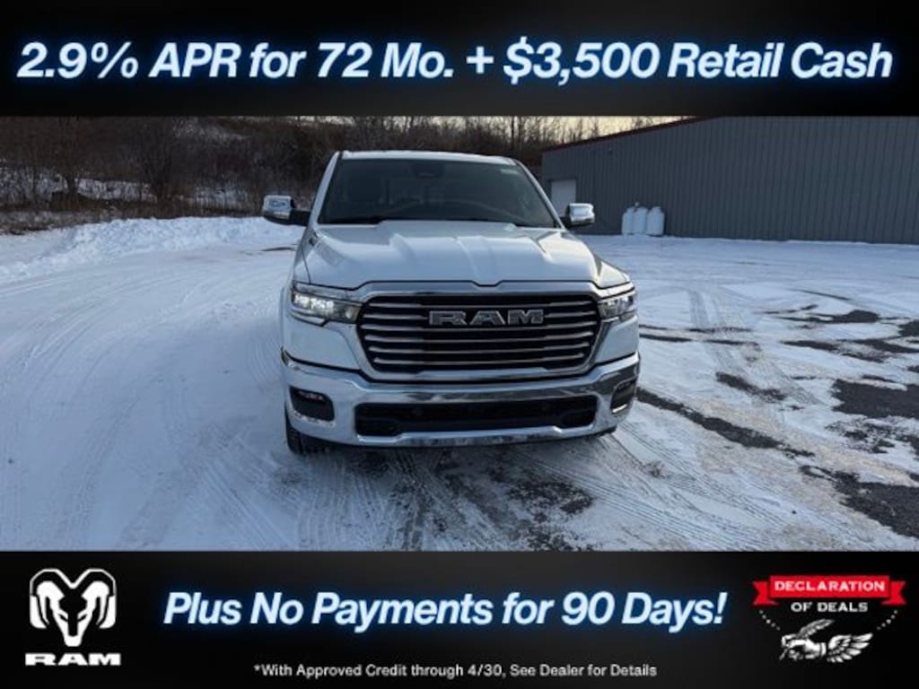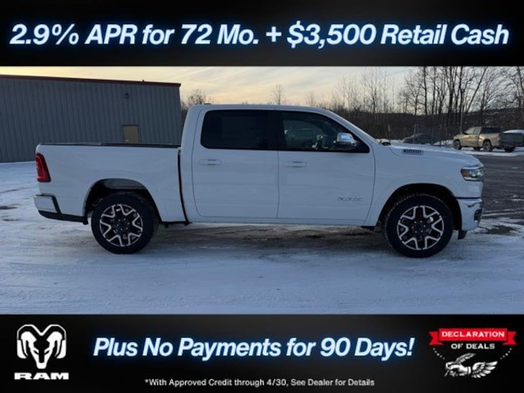 Bright White Clearcoat 2026 Ram 1500 Laramie 4WD 8-Speed Automatic 3.0L I6 Save Time at the Dealership by Customizing your Deal Online!, 10 Speakers, 3.55 Rear Axle Ratio, 4-Wheel Disc Brakes, 4G LTE Wi-Fi Hot Spot, ABS brakes, Active Noise Control System, Adjustable pedals, Air Conditioning, Alloy wheels, AM/FM radio: SiriusXM with 360L, Apple CarPlay/Android Auto, Audio memory, Auto High-beam Headlights, Auto Power-Folding Mirrors, Auto-dimming door mirrors, Auto-Dimming Exterior Driver Mirror, Auto-dimming Rear-View mirror, Automatic temperature control, Brake assist, Bumpers: chrome, Chrome Exterior Mirrors, Compass, Connected Travel and Traffic Services, Connectivity - US/Canada, Convex Wide-Angle Exterior Mirror Insert, Delay-off headlights, Driver door bin, Driver vanity mirror, Dual front impact airbags, Dual front side impact airbags, Electronic Stability Control, Exterior Mirrors Courtesy Lamps, Exterior Mirrors with Heating Element, Exterior Mirrors with Memory, Exterior Mirrors with Supplemental Signals, Front anti-roll bar, Front Bucket Seats, Front Center Armrest w/Storage, Front dual zone A/C, Front fog lights, Front License Plate Bracket, Front reading lights, Front wheel independent suspension, Fully automatic headlights, Garage door transmitter, GPS Navigation, Heated door mirrors, Heated front seats, Heated rear seats, Heated steering wheel, Illuminated entry, Integrated Center Stack Radio, Integrated Voice Command with Bluetooth, Leather steering wheel, Leather Trimmed Bucket Seats, Low tire pressure warning, Manufacturer's Statement of Origin, Memory seat, Navigation System, Occupant sensing airbag, Off-Road Information Pages, Outside temperature display, Overhead airbag, Overhead console, Panic alarm, ParkView Rear Back-Up Camera, Passenger door bin, Passenger vanity mirror, Pedal memory, Power door mirrors, Power driver seat, Power passenger seat, Power steering, Power windows, Quick Order Package 21H Laramie, Radio data system, Radio: Uconnect 5 Navigation with 12.0" Display, RAM Grille Badge - Chrome, Rear anti-roll bar, Rear reading lights, Rear seat center armrest, Rear step bumper, Remote keyless entry, Security system, SiriusXM Radio Service, SiriusXM with 360L, Speed control, Split folding rear seat, Steering wheel mounted audio controls, Tachometer, Telescoping steering wheel, Tilt steering wheel, Traction control, Trip computer, Turn signal indicator mirrors, USB Host Flip, Variably intermittent wipers, Ventilated front seats, Voltmeter, Wheels: 20" x 9" Premium Paint/Polish.