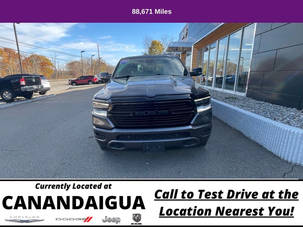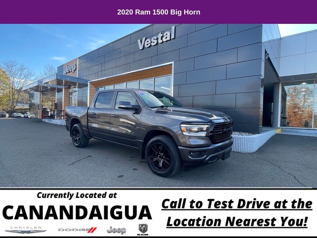 1-Year SiriusXM Radio Service, 1-Yr SiriusXM Guardian Trial, 115V Auxiliary Power Outlet, 115V Auxiliary Rear Power Outlet, 12" Touchscreen Display, 2 USB Full Function/Charge Only Media Hub, 2nd Row In Floor Storage Bins, 3 Rear Seat Head Restraints, 3.21 Rear Axle Ratio, 4 Way Front Headrests, 4-Wheel Disc Brakes, 400W Inverter, 48V Belt Starter Generator, 4G LTE Wi-Fi Hot Spot, 5-Year SiriusXM Traffic Service, 5-Year SiriusXM Travel Link Service, 6 Speakers, 9 Amplified Speakers w/Subwoofer, ABS brakes, Air Conditioning, Air Conditioning ATC w/Dual Zone Control, Alloy wheels, AM/FM radio, Anti-Spin Differential Rear Axle, Apple CarPlay, Auto-Dimming Exterior Driver Mirror, Auto-Dimming Rear-View Mirror, Bed Utility Group, Big Horn Badge, Big Horn IP Badge, Big Horn Level 2 Equipment Group, Black Exterior Truck Badging, Black Headlamp Bezels, Black Interior Accents, Black Premium Power Mirrors, Blind Spot & Cross Path Detection, Bluetooth, Body Color Door Handles, Body Color Exterior Mirrors, Body Color Front Bumper, Body Color Premium Power Mirrors, Body Color Rear Bumper w/Step Pads, Brake assist, Bucket Seats, Bumpers: chrome, Class IV Receiver Hitch, Cloth Bench Seat, Compass, Dampened Tailgate, Delay-off headlights, Deluxe Cloth Bucket Seats, Disassociated Touchscreen Display, Dome Dual LED Reading Lamp, Driver door bin, Dual Exhaust w/Black Tips, Dual front impact airbags, Dual front side impact airbags, Dual-Pane Panoramic Sunroof, Electronic Stability Control, Engine Calibration Flash (DISC), Exterior Mirrors Courtesy Lamps, Exterior Mirrors w/Memory, Foam Bottle Insert (Door Trim Panel), For Details, Visit DriveUconnect.com, Front anti-roll bar, Front Center Armrest w/Storage, Front fog lights, Front LED Fog Lamps, Front reading lights, Front Seat Back Map Pockets, Front wheel independent suspension, Full Length Floor Console, Fully automatic headlights, Glove Box Lamp, Google Android Auto, GPS Antenna Input, GPS Navigation, Grille Surround 1 Black Texture 2 Black, HD Radio, Heated door mirrors, Heated Front Seats, Heated Steering Wheel, Illuminated entry, Integrated Center Stack Radio, Leather steering wheel, LED Footwell Lighting, LED Reflector Headlamps, LED Taillamps, Low tire pressure warning, Manual Adjust 4-Way Front Passenger Seat, Night Edition, Occupant sensing airbag, Outside temperature display, Overhead airbag, Overhead console, Overhead LED Lamps, Panic alarm, ParkSense Front/Rear Park Assist w/Stop, ParkView Rear Back-Up Camera, Passenger door bin, Passenger vanity mirror, Pick-Up Box Lighting, Power 4-Way Driver Lumbar Adjust, Power 8-Way Driver Seat, Power Adjustable Pedals, Power door mirrors, Power steering, Power windows, Power-Folding Mirrors, Premium Lighting Group, Premium Overhead Console, Quick Order Package 27Z Big Horn, Radio data system, Radio: Uconnect 12 w/Navigation, Radio: Uconnect 3 w/5" Display, Radio: Uconnect 4 w/8.4" Display, RamBox Cargo Management System, Rear 60/40 Folding Seat, Rear anti-roll bar, Rear Dome w/On/Off Switch Lamp, Rear Power Sliding Window, Rear seat center armrest, Rear step bumper, Rear Window Defroster, Remote keyless entry, Remote Start System, Security Alarm, SiriusXM Satellite Radio, SiriusXM Traffic Plus, SiriusXM Travel Link, SiriusXM w/360L, Speed control, Split folding rear seat, Spray In Bedliner, Steering wheel mounted audio controls, Sun Visors w/Illuminated Vanity Mirrors, Tachometer, Telescoping steering wheel, Tilt steering wheel, Traction control, Trip computer, Universal Garage Door Opener, USB Host Flip, Variably intermittent wipers, Wheels: 18" x 8" Cast-Aluminum Painted, Wheels: 20" x 9.0" Premium Paint/Polished. 2020 Ram 1500 4D Crew Cab Big Horn/Lone Star Granite Crystal Metallic Clearcoat 4WD 8-Speed Automatic HEMI 5.7L V8 Multi Displacement VVT